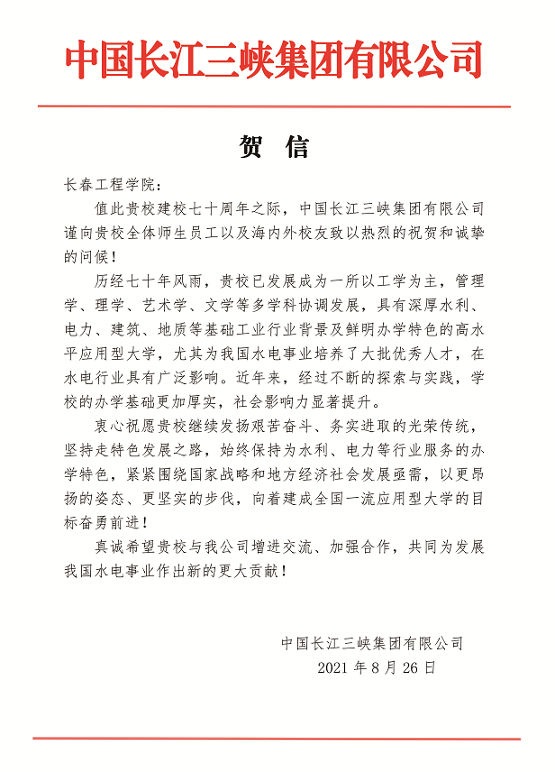 2021年8月30日,学校收到中国长江三峡集团有限公司发来的贺信,在学校建校70周年华诞来临之际,向马博手机版全体师生员工及海内外校友,致以热烈的祝贺和诚挚的问候!贺信全文如下: