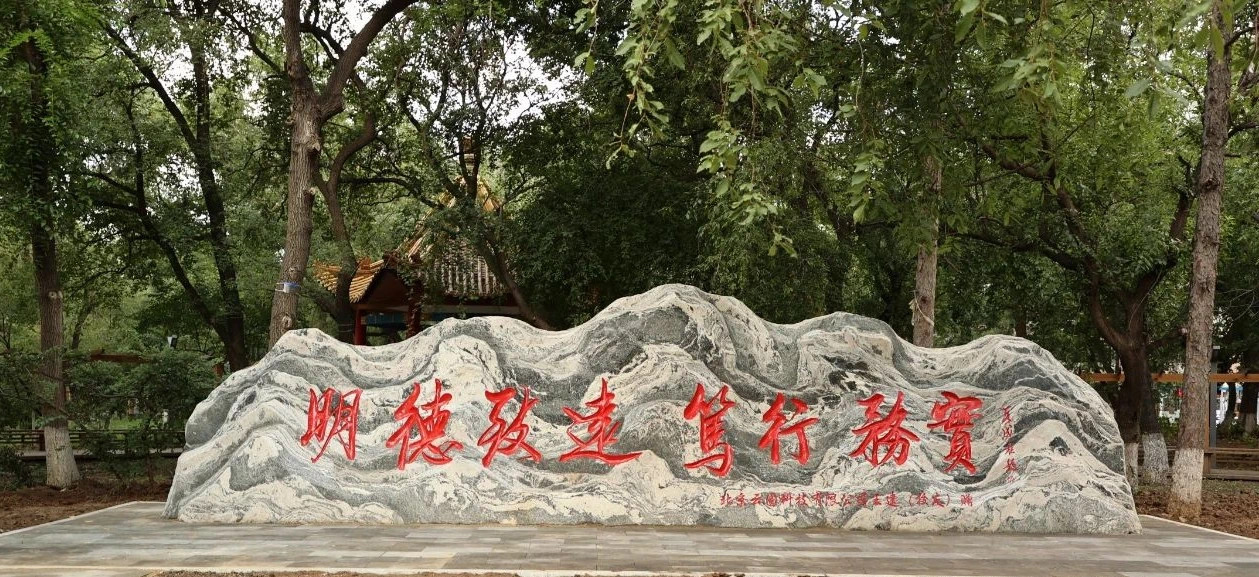 校训石采自泰山,重达55吨,正面镌刻着著名书法家段成桂校友亲笔题写“明德致远 笃行务实”的校训,彰显了学校悠久的办学理念和厚重的文化底蕴。