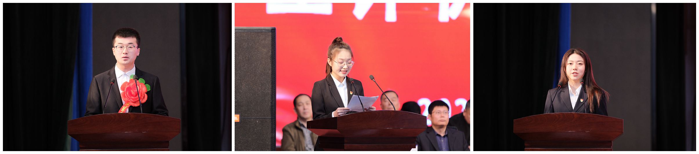 管理学院工管1842班张诗航、国际教育学院动力1845班游蕊嘉、外国语学院英语1942班张瑷琳分别代表获得表彰的先进集体、先进个人、社会捐赠奖助学金获得者在大会上发言。