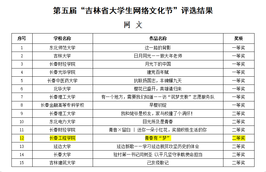 为深入学习贯彻习近平新时代中国特色社会主义思想,加大优秀网络文化供给力度,吉林省教育厅举办了第五届“吉林省大学生网络文化节”和“全省高校网络教育优秀作品推选展示活动”。近日吉林省教育厅下发了《关于公布第五届吉林省大学生网络文化节和高校网络教育优秀作品推选展示活动评选结果的通知》,我校喜获一等奖、二等奖、三等奖各一项。