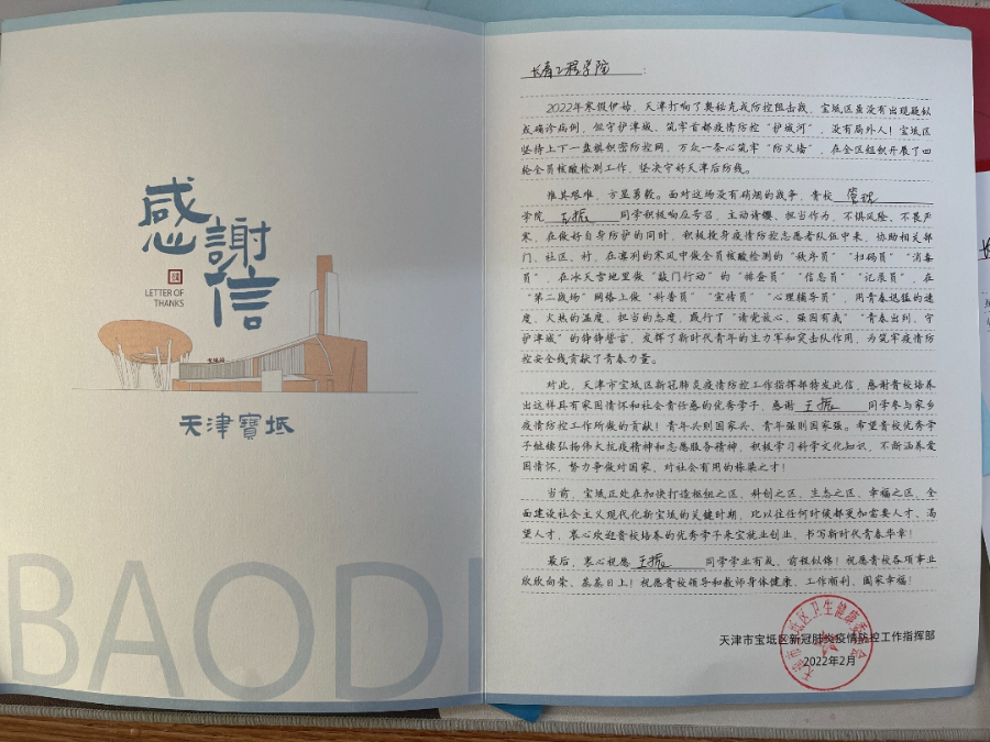 近日,学校收到来自天津市宝坻区新冠肺炎疫情防控工作指挥部的感谢信,信中对马博手机版及周政峤等几位同学表示感谢。
