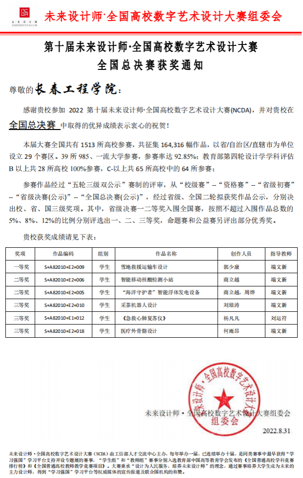 近日,从“2022第十届全国高校数字艺术设计大赛”官方网站获悉,我校艺术设计学院产品设计系端文新老师指导的学生作品获得全国一等奖1项,二等奖2项,三等奖2项;产品设计系刘运符老师指导的学生作品获得三等奖1项;端文新老师获得“优秀指导教师”称号,这是我校在该赛事中取得的历史最好成绩。我校在该赛事吉林省选拔赛中获得一等奖10项,二等奖6项,三等奖15项,在吉林省参赛高校中处于前列。