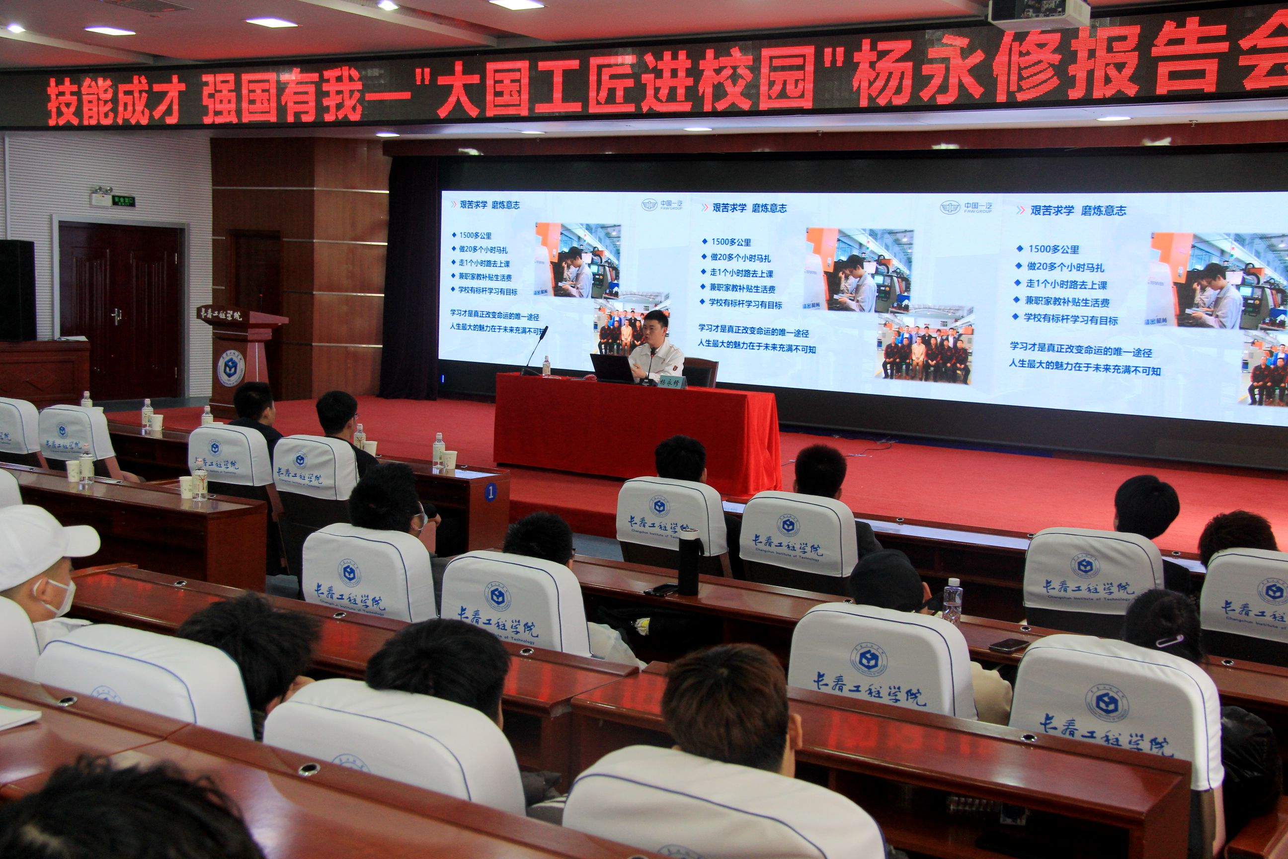 此次报告会邀请第十四届全国人大代表,中国第一汽车股份有限公司研发总院试制所加工中心技能师、高级技师、高级工程师,“全国五一劳动奖章”获得者,国务院政府特殊津贴享有者杨永修来校为师生做事迹分享。