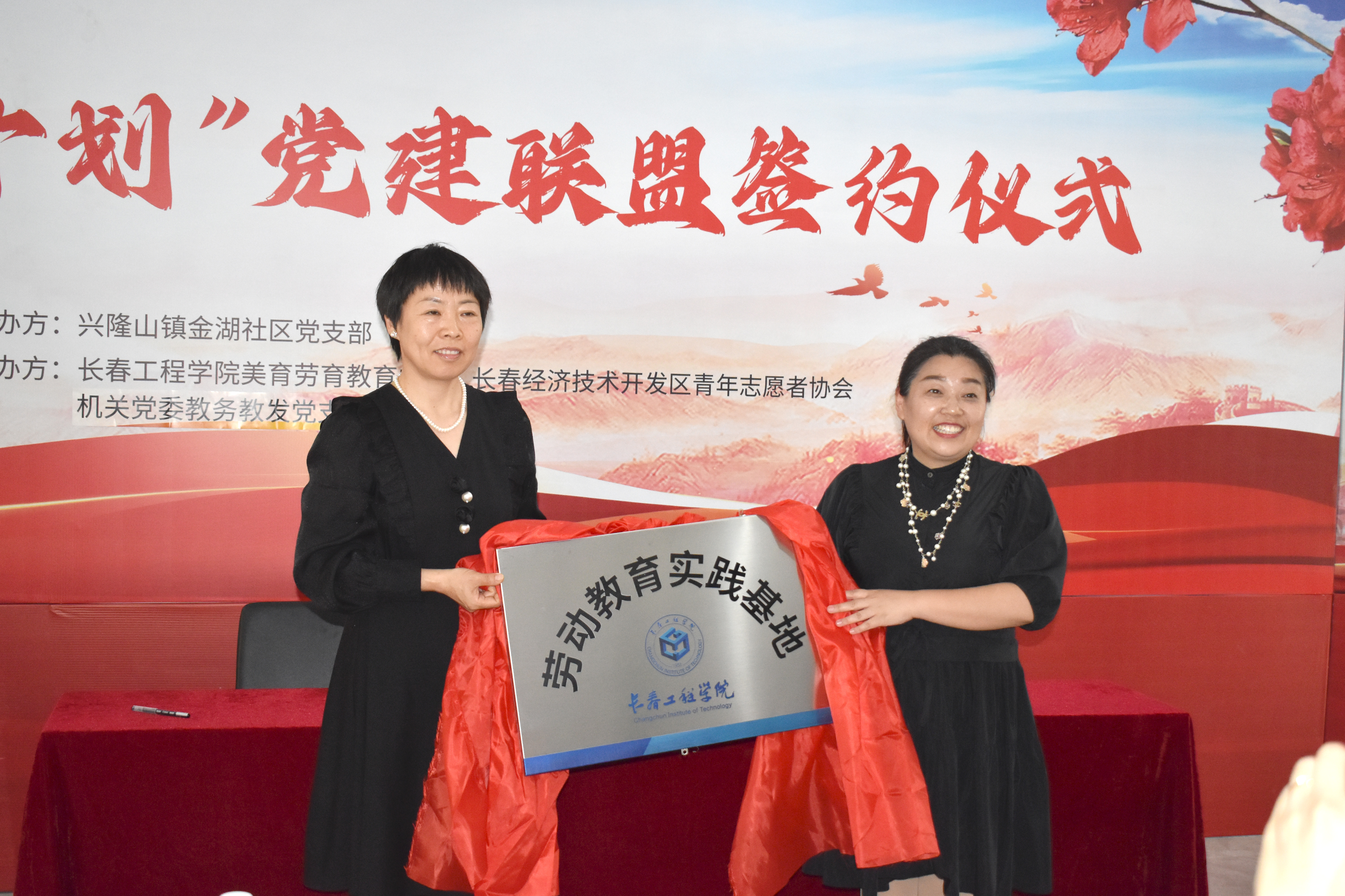 5月31日,学校机关党委教务教发党支部与兴隆山镇金湖社区、长春经济技术开发区青年志愿者协会三方结对共建“映山红·红蕊计划”党建联盟签约仪式在金湖社区活动中心举行。