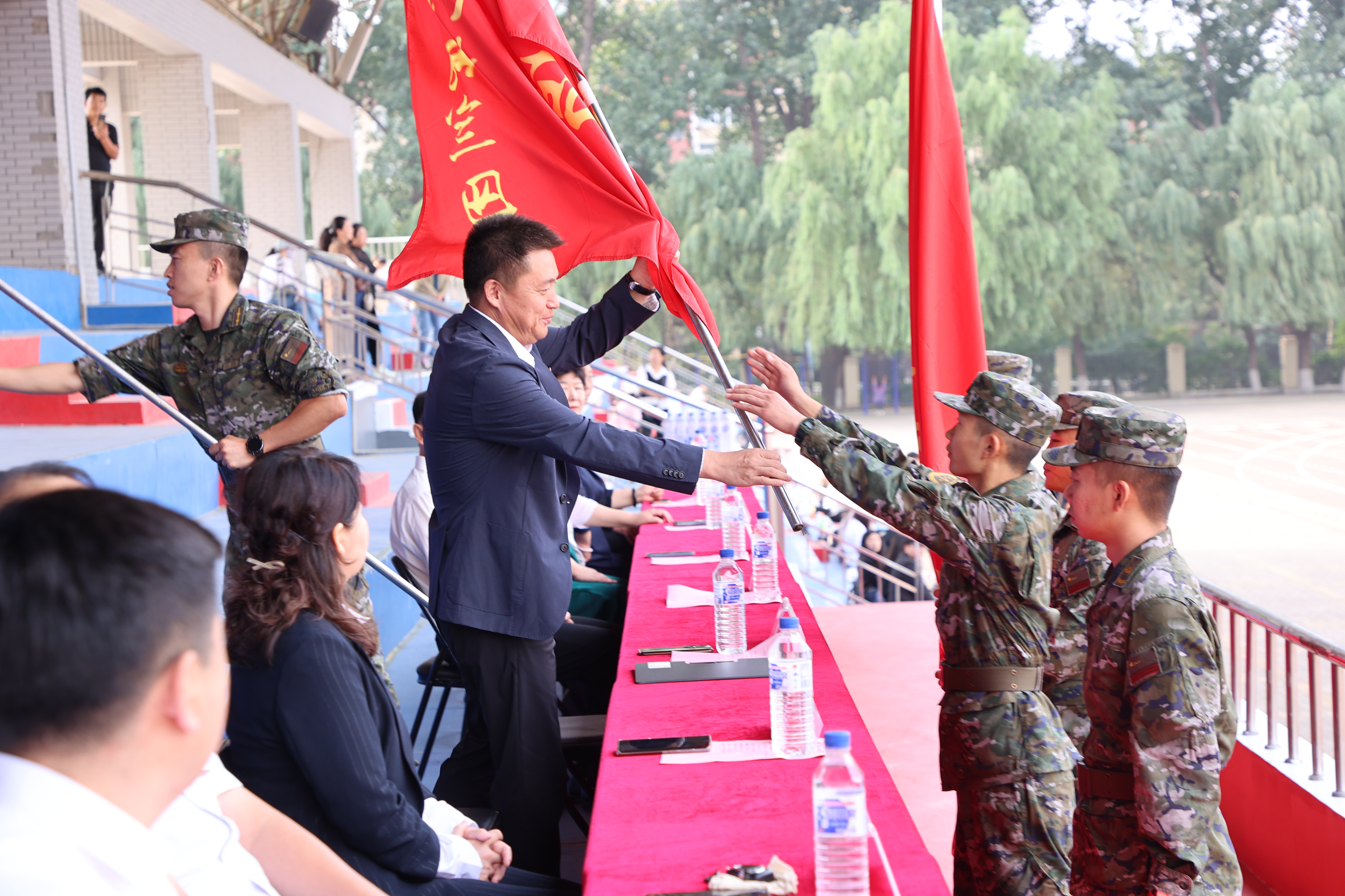 在仪式上,刘兆国副书记为军训团授团旗,高峰参谋长和张邦成副校长为各营授营旗。