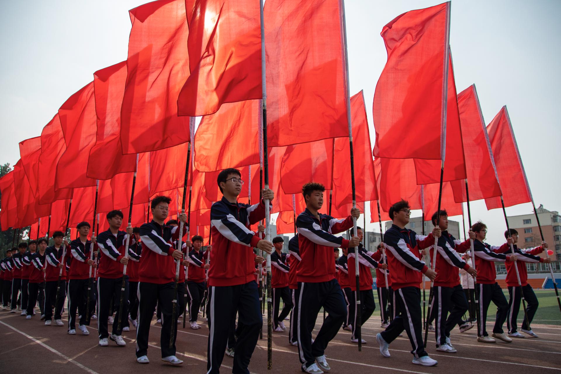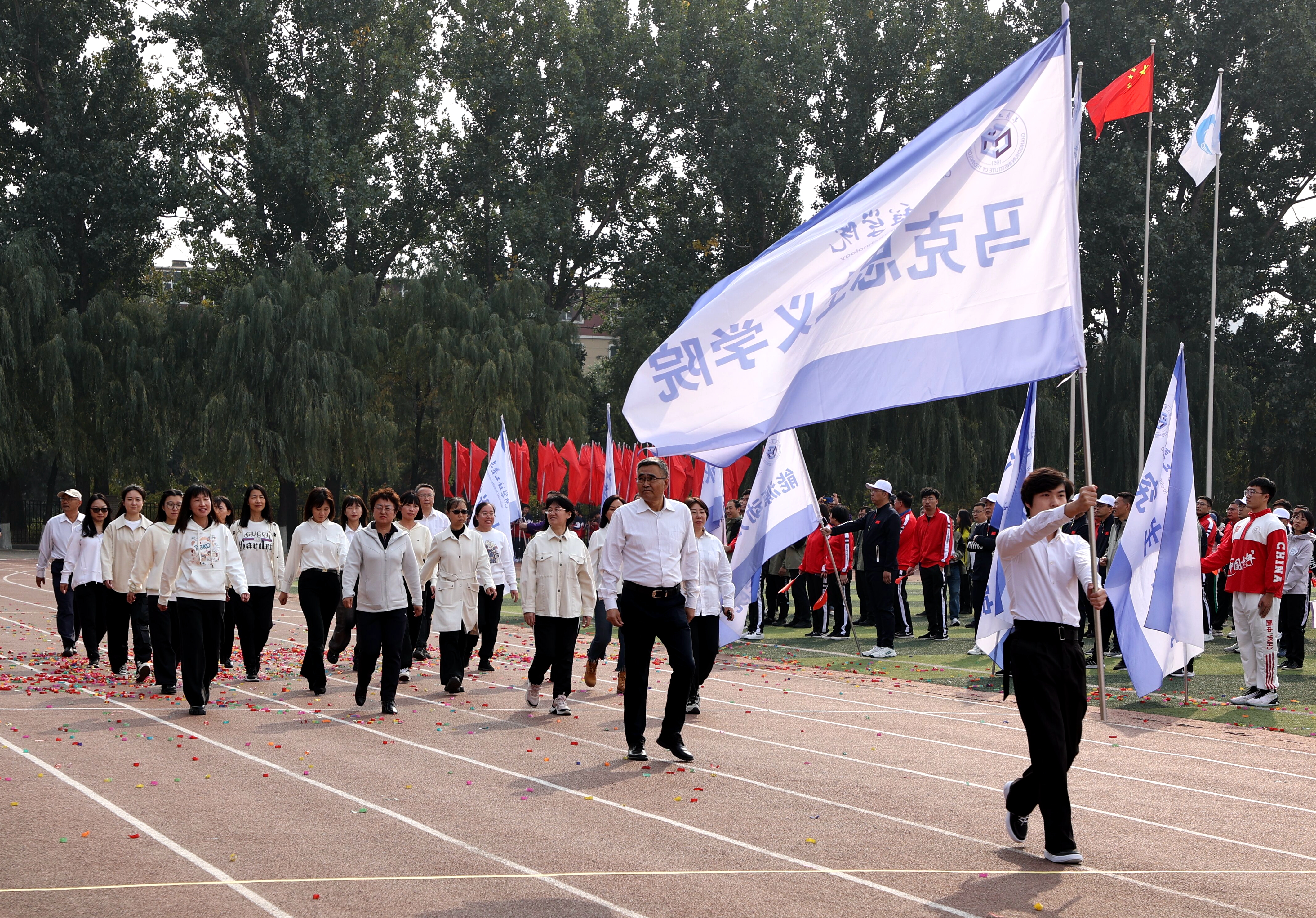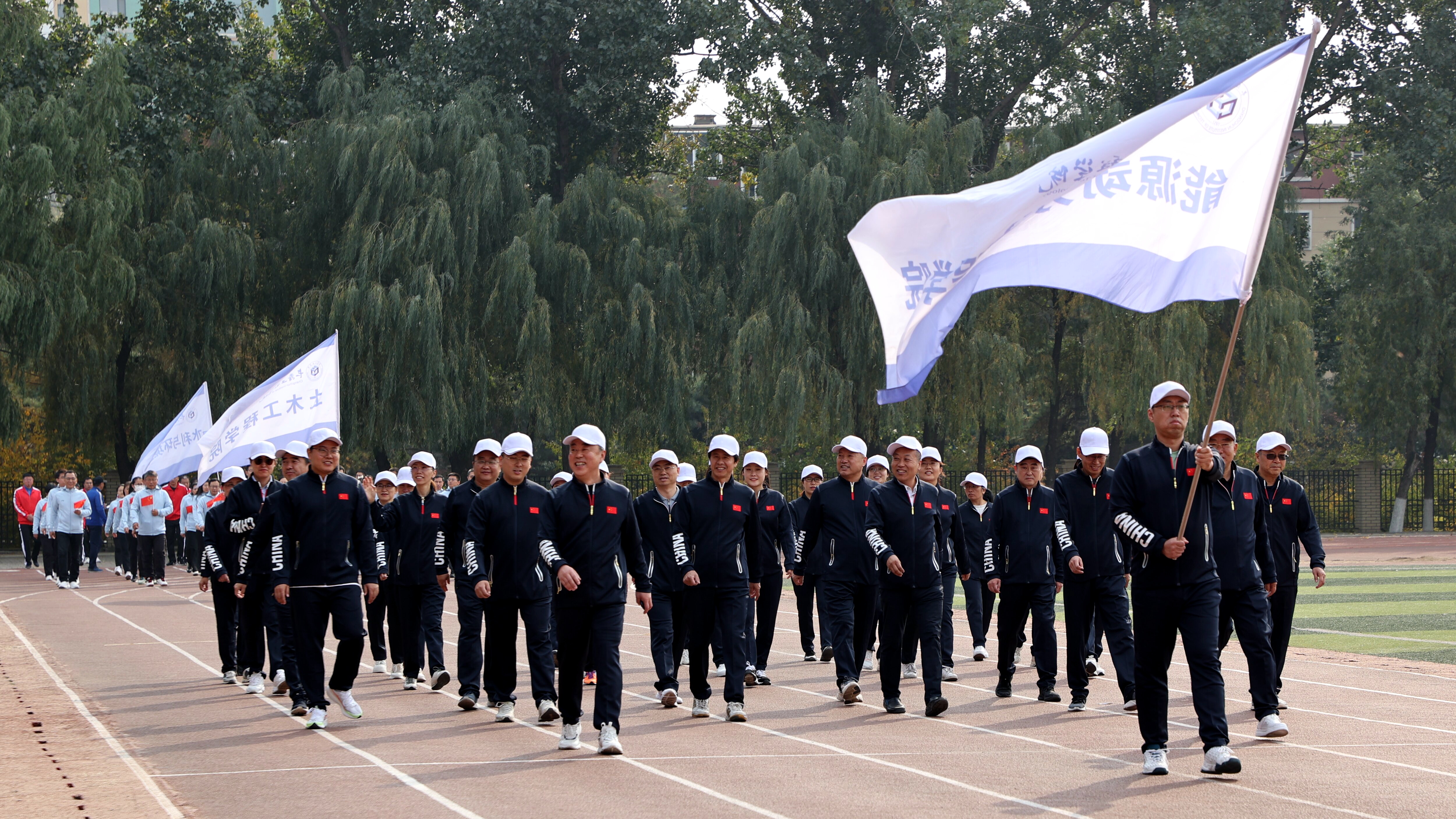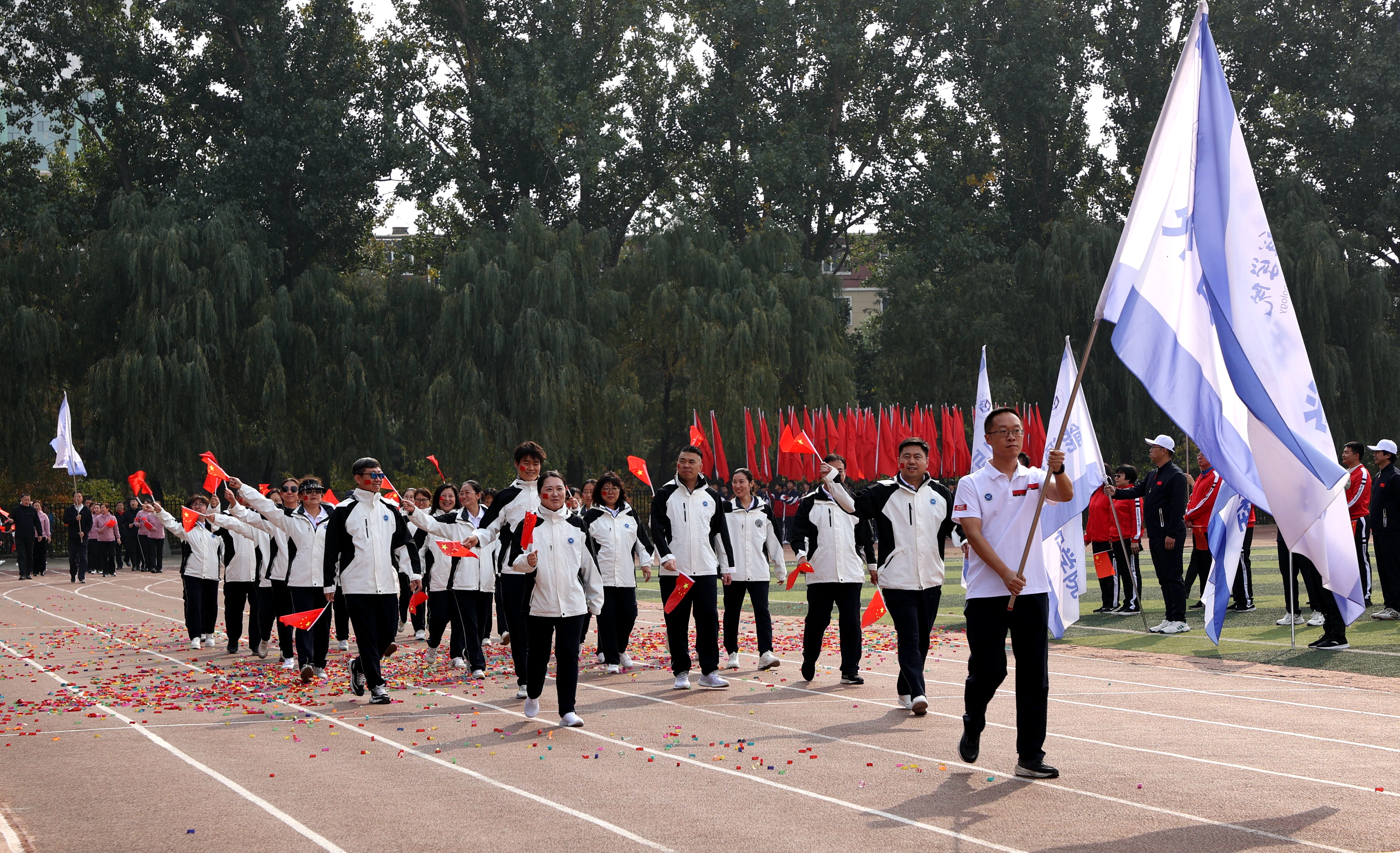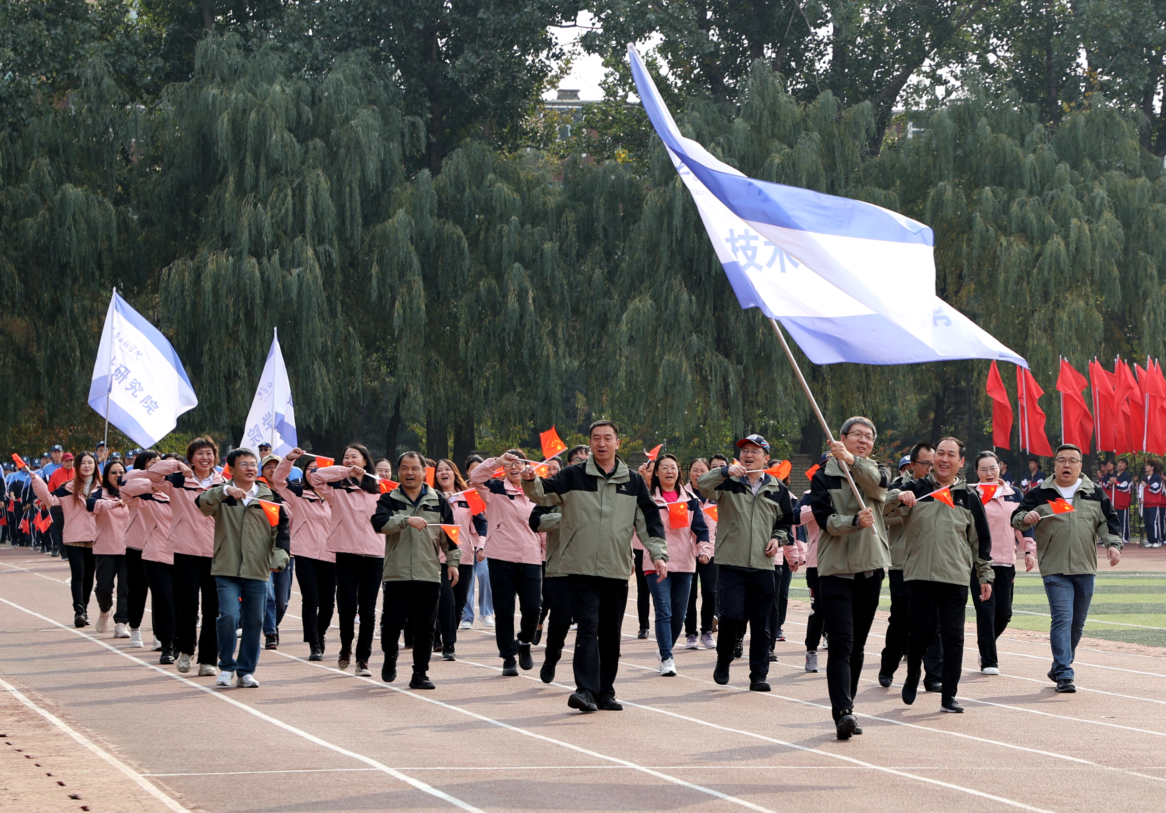 伴随着运动员进行曲,25个分工会代表队迈着有力的步伐、喊着嘹亮的口号,依次走过主席台接受检阅,充分展示出我校教职员工明德致远、笃行务实、脚踏实地、锐意进取的精神追求。