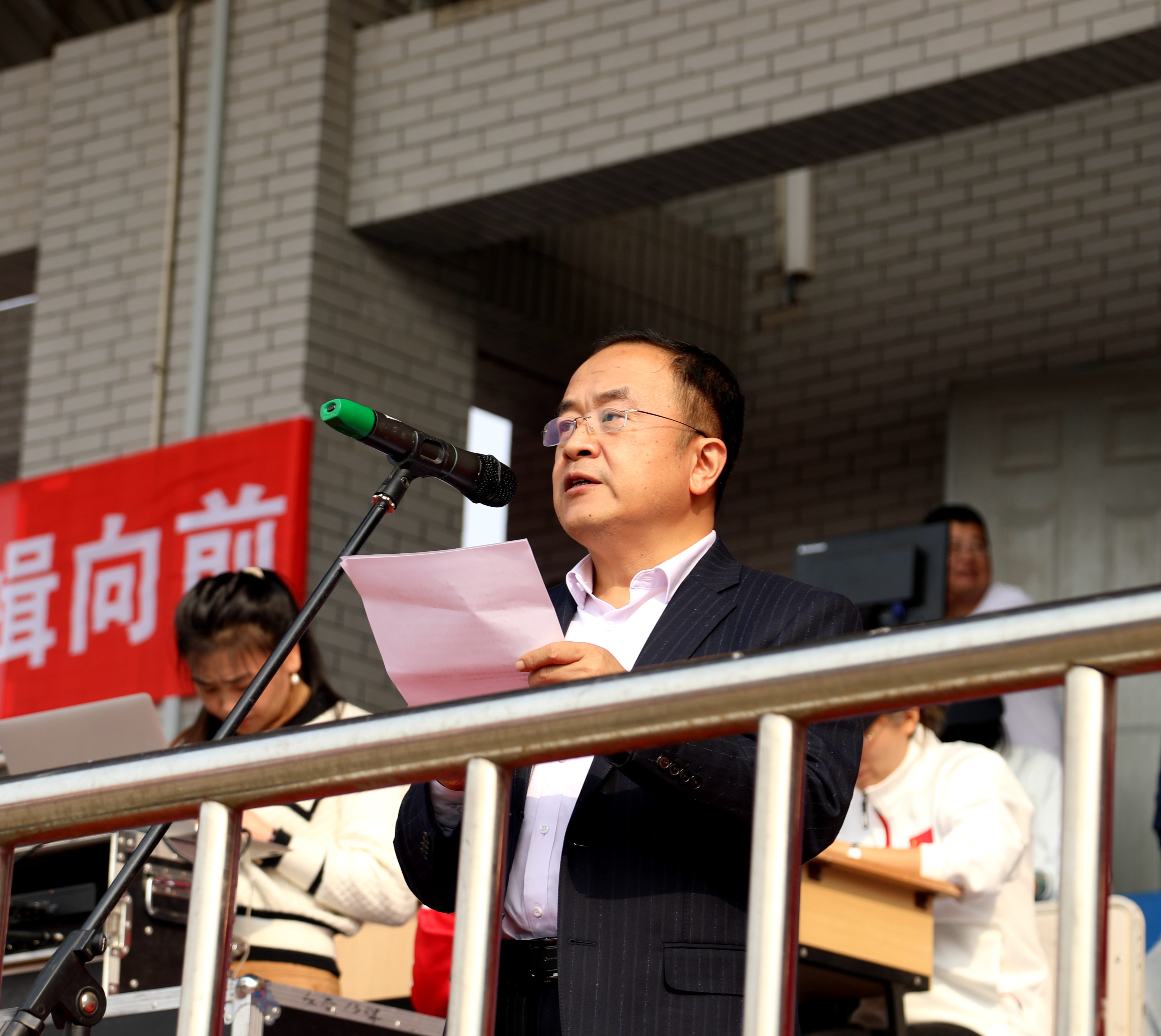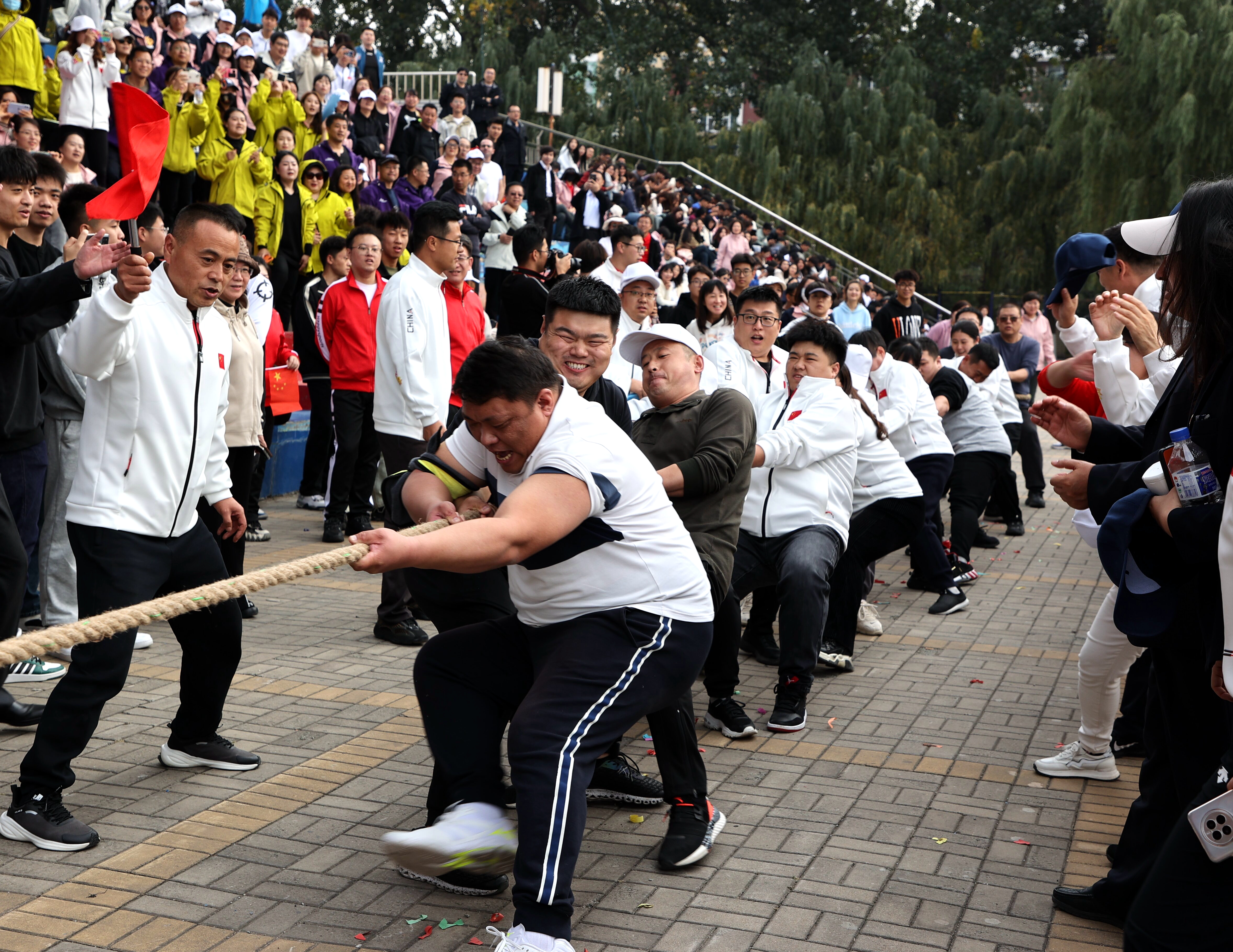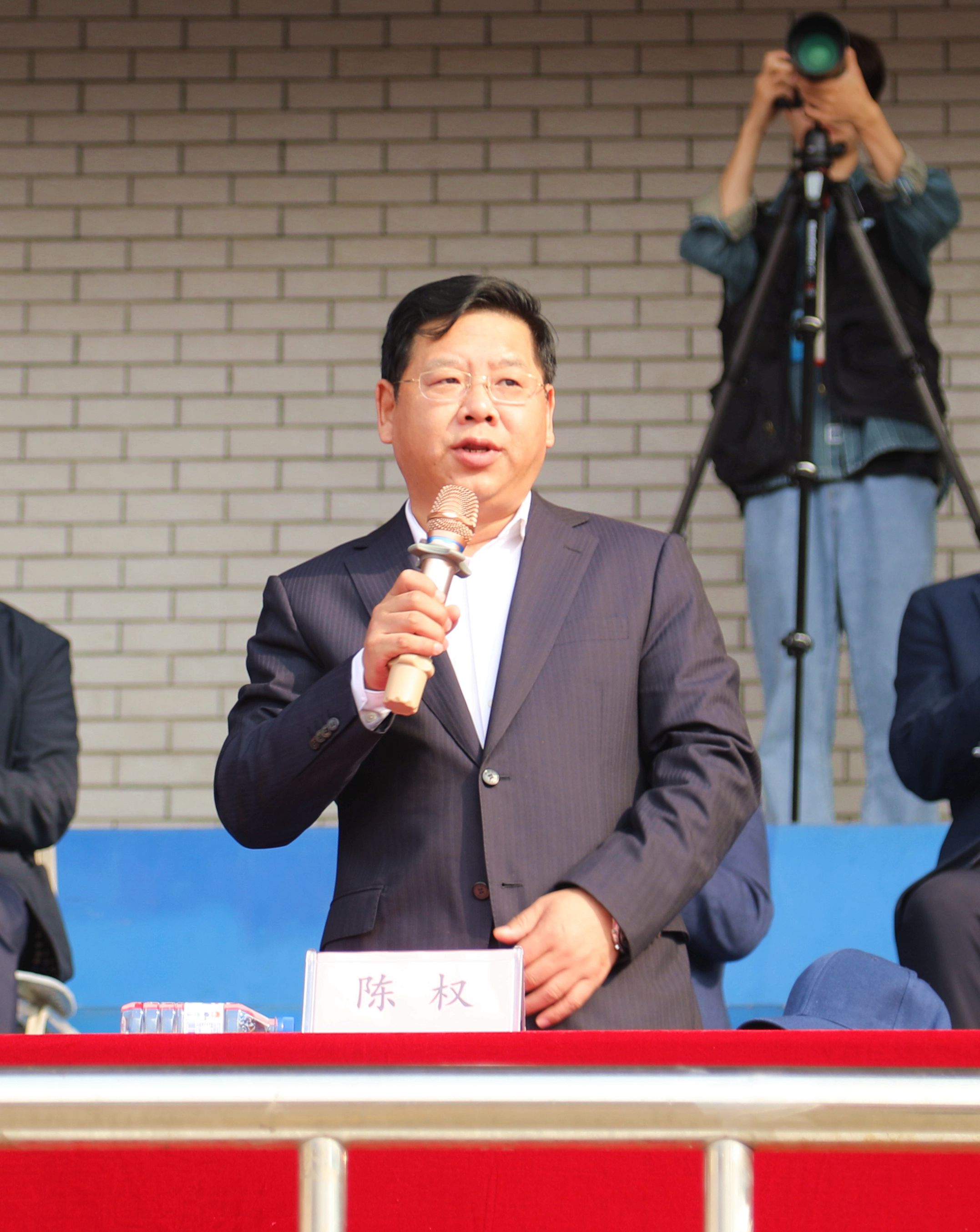 校长陈权宣布马博手机版第四届教职工趣味运动会开幕。运动场上鼓声阵阵,队旗挥舞。