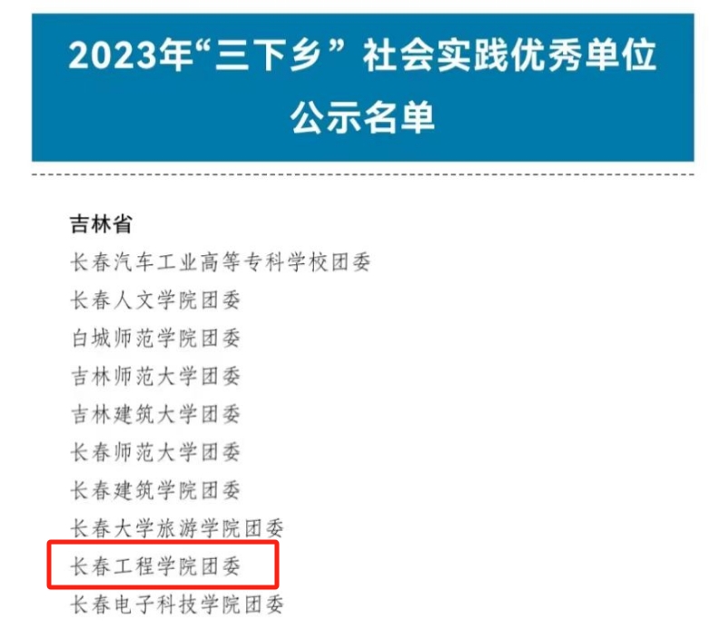 2023年,学校团委以“跟着总书记脚步看吉林”为主题组织开展“三下乡”社会实践活动,参与规模大、社会反响好,6支团队获评省市级优秀实践团队,15名师生获得市级优秀指导教师、先进个人、优秀随笔等荣誉。