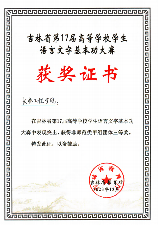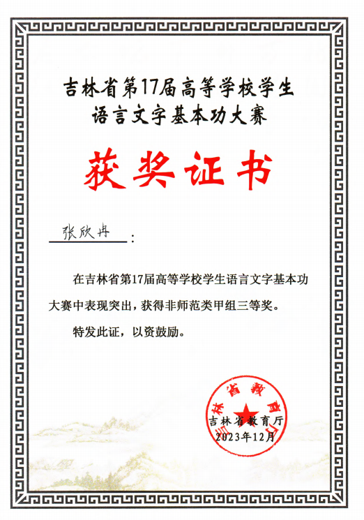 近日,由吉林省教育厅、吉林省语言文字委员会主办,吉林省普通话培训测试中心、吉林教育电视台承办的吉林省第17届高等学校学生语言文字基本功大赛圆满落下帷幕。我校获得非师范类甲组团体三等奖,国际教育学院学生张欣冉获非师范类甲组三等奖。