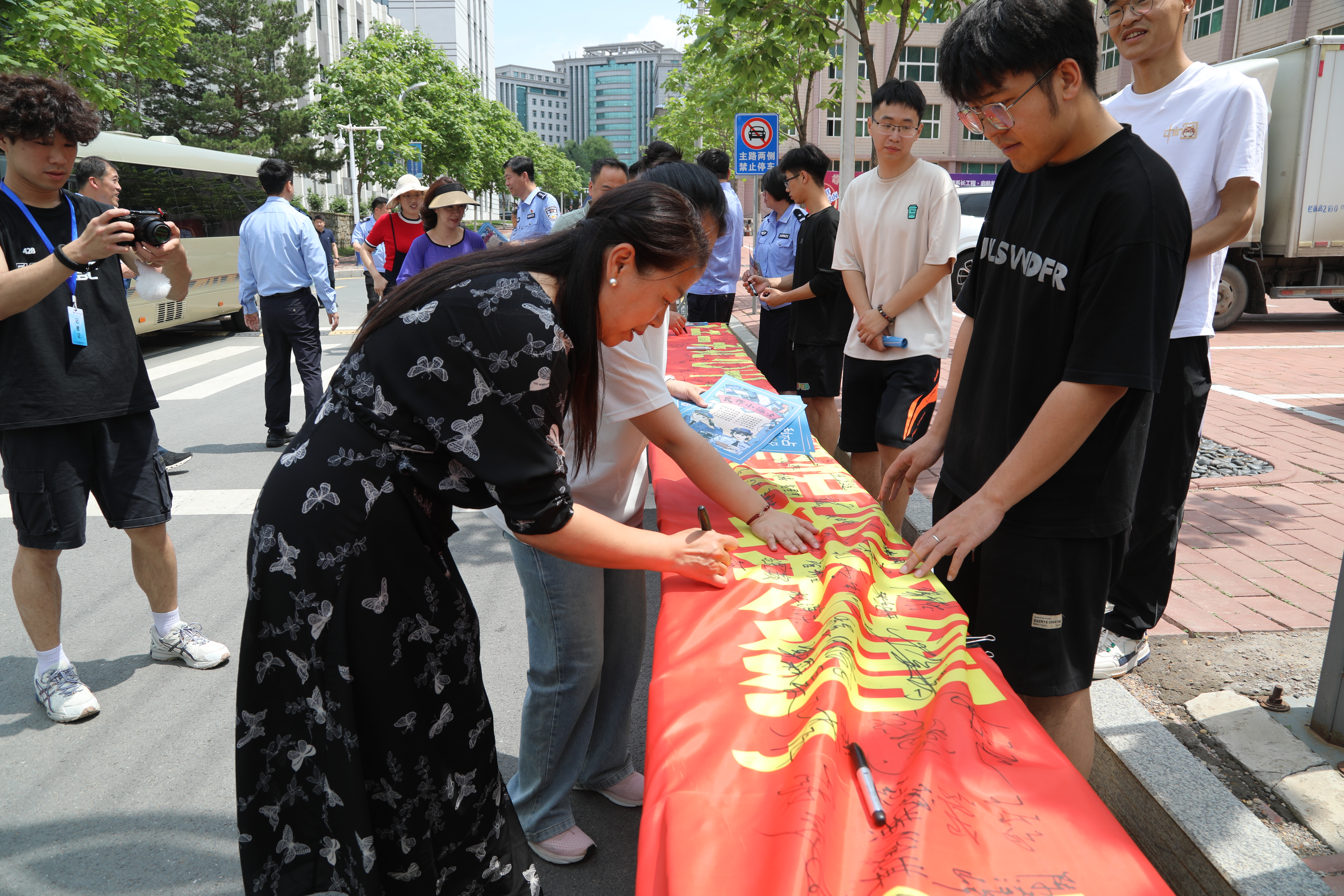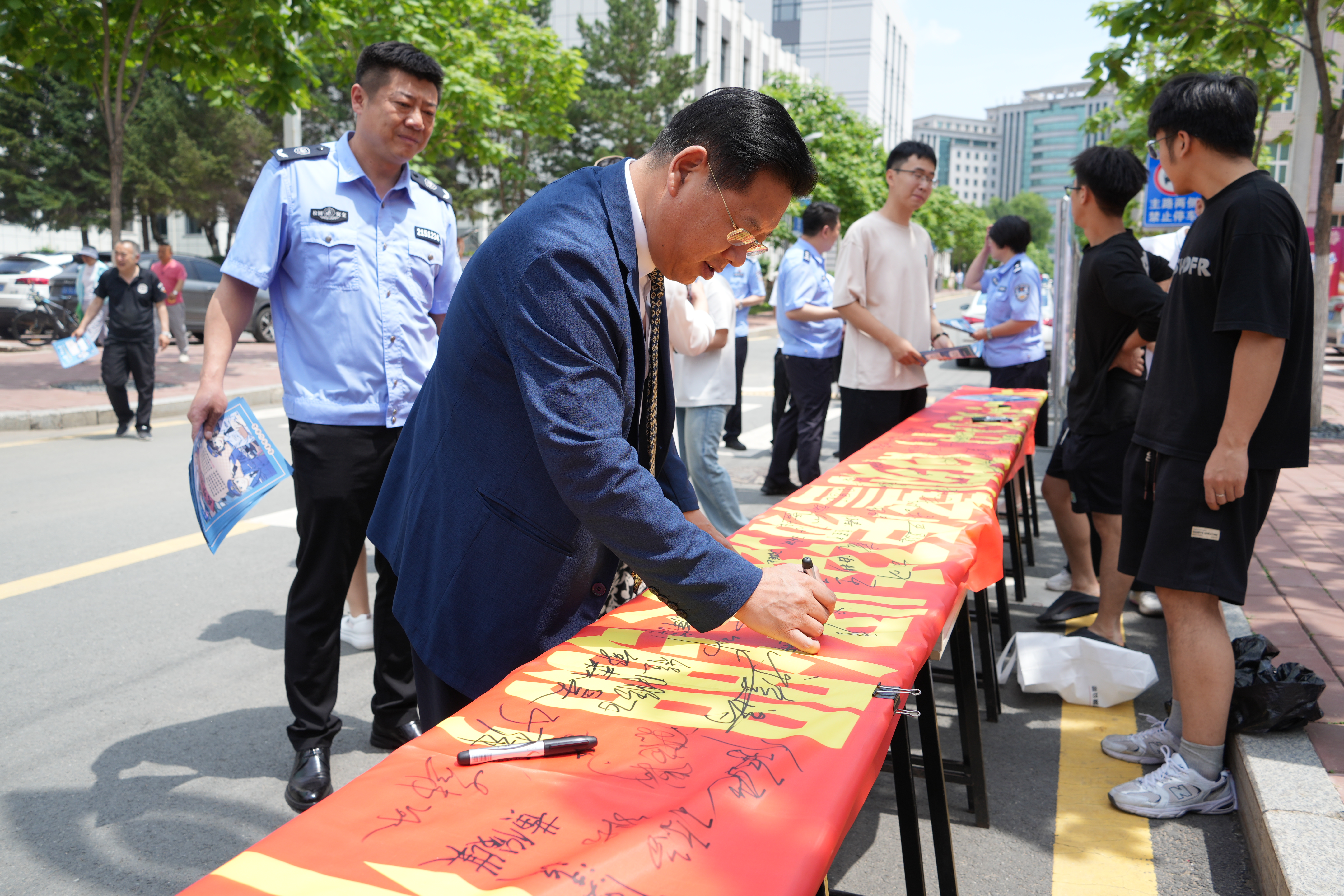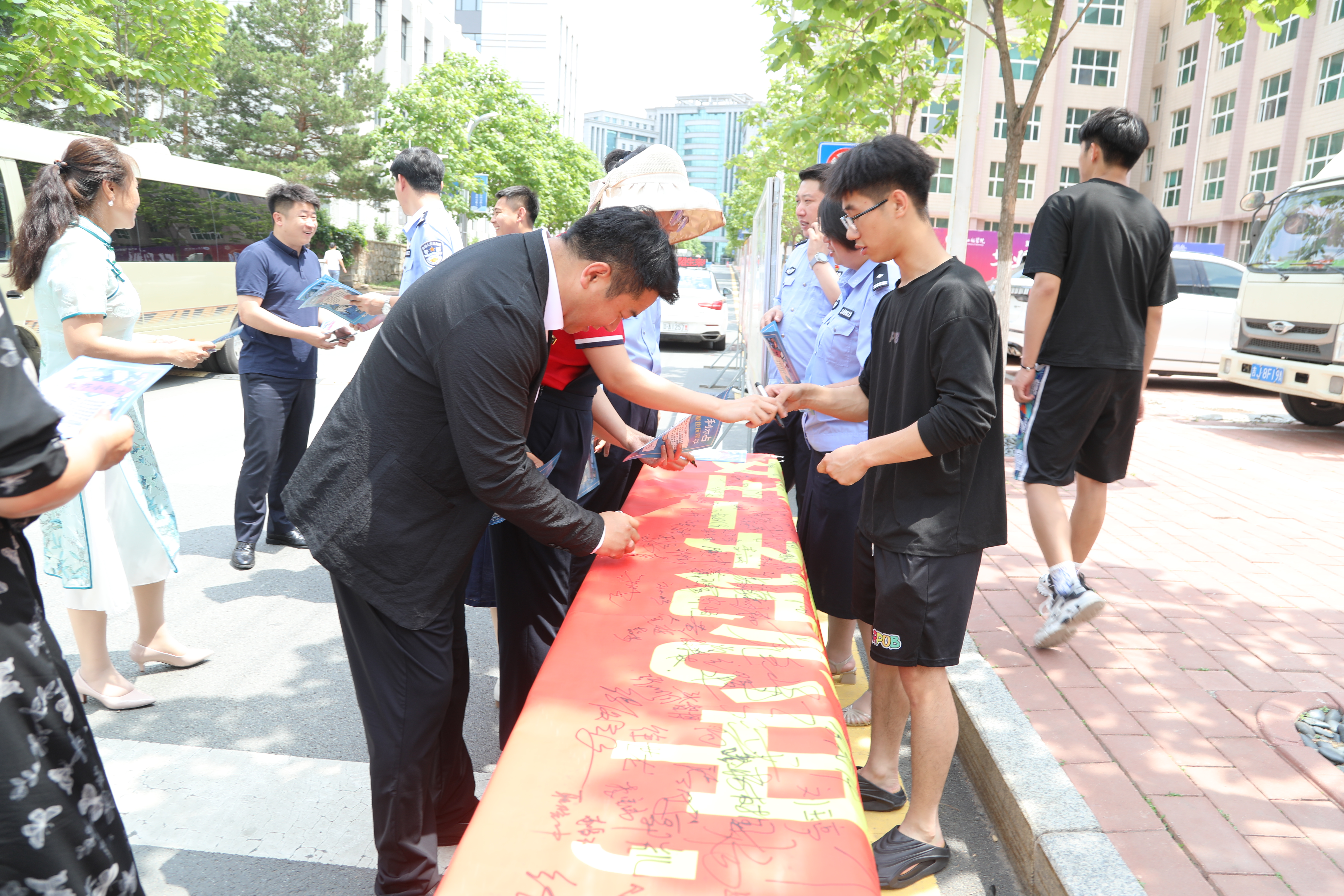 为强化全国“安全宣传咨询日”的宣传力度,进一步提升全校师生的安全意识和应急处置能力,6月14日,学校安全保卫处联合长春市公安局内保支队、朝阳分局自由大路派出所和宽平大路派出所,面向全校师生开展了“安全二字记心中,时刻警惕弦紧绷,校园事故不发生,平安幸福伴君行”承诺践诺签名及“反诈宣传进校园”活动。活动现场,属地的公安民警与学校安全保卫处的同志们共同向广大师生就安全防范和应急知识进行了科普,并发放了宣传手册。