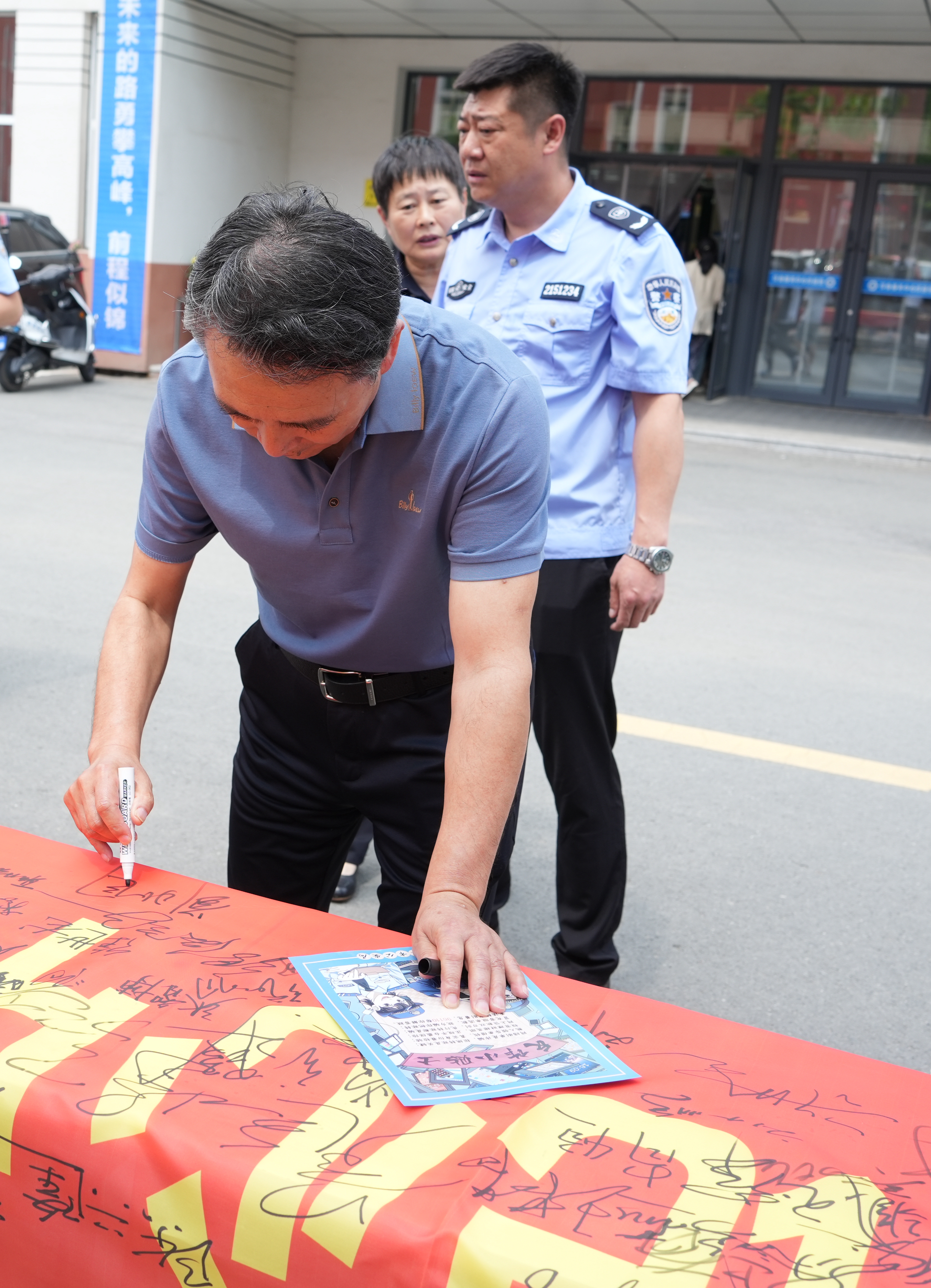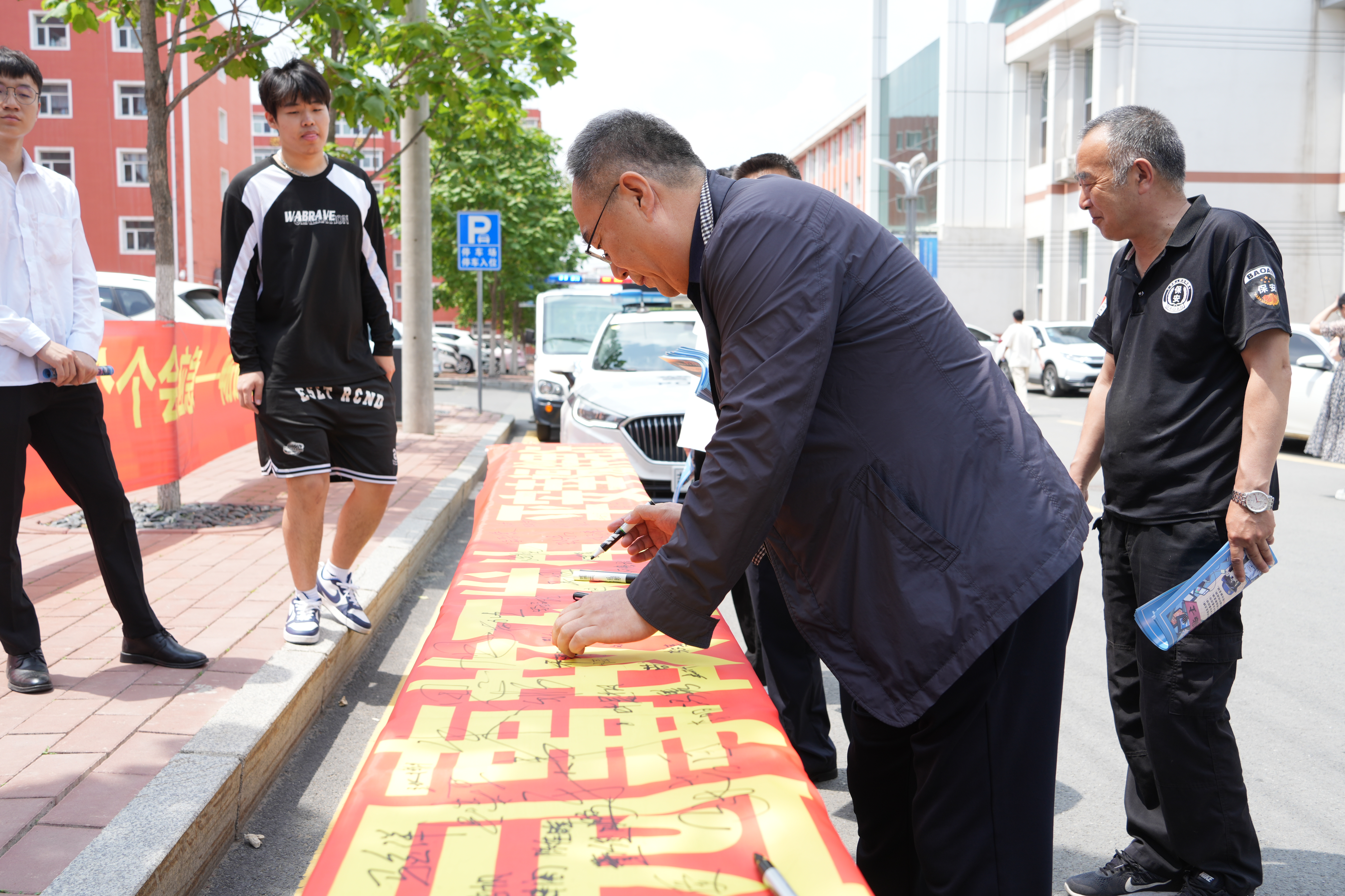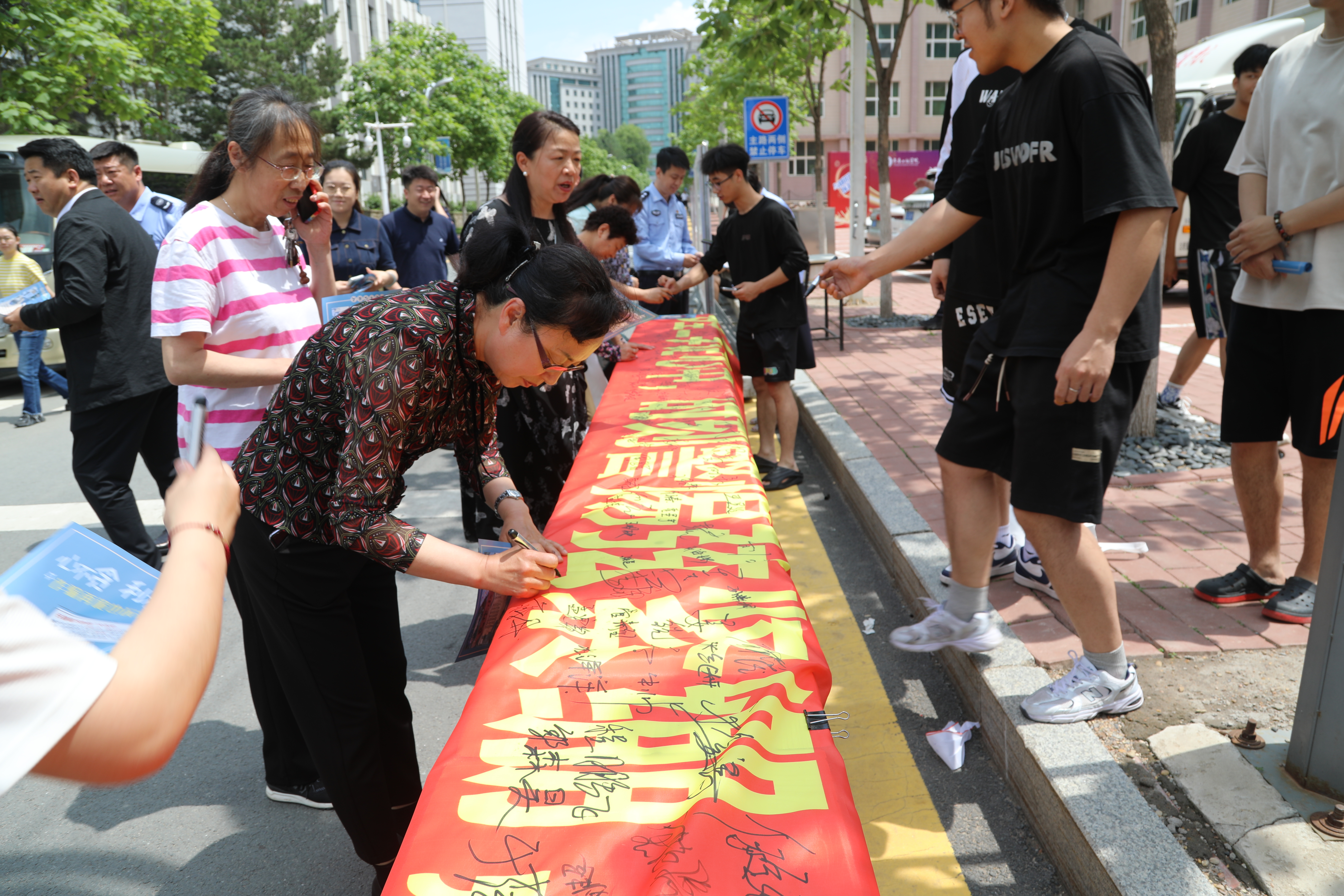 为强化全国“安全宣传咨询日”的宣传力度,进一步提升全校师生的安全意识和应急处置能力,6月14日,学校安全保卫处联合长春市公安局内保支队、朝阳分局自由大路派出所和宽平大路派出所,面向全校师生开展了“安全二字记心中,时刻警惕弦紧绷,校园事故不发生,平安幸福伴君行”承诺践诺签名及“反诈宣传进校园”活动。活动现场,属地的公安民警与学校安全保卫处的同志们共同向广大师生就安全防范和应急知识进行了科普,并发放了宣传手册。