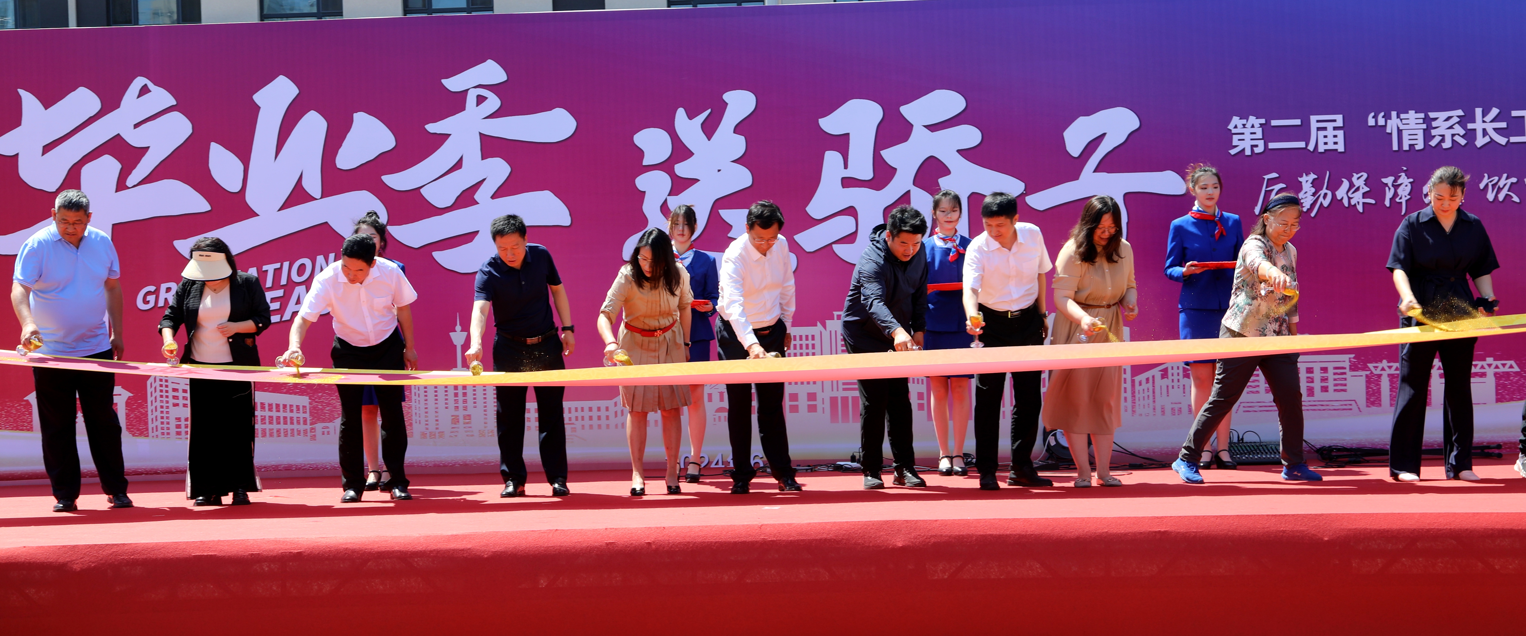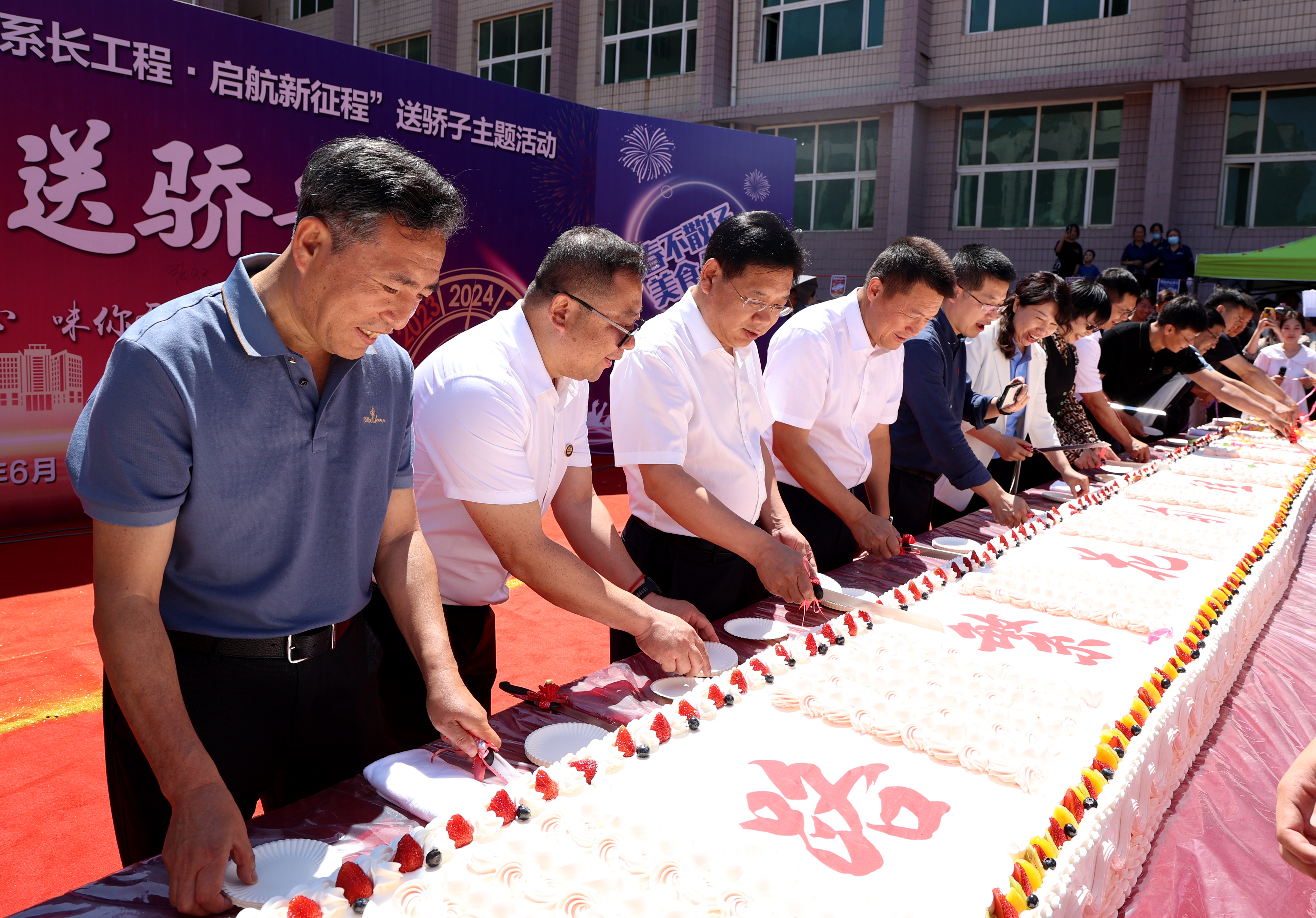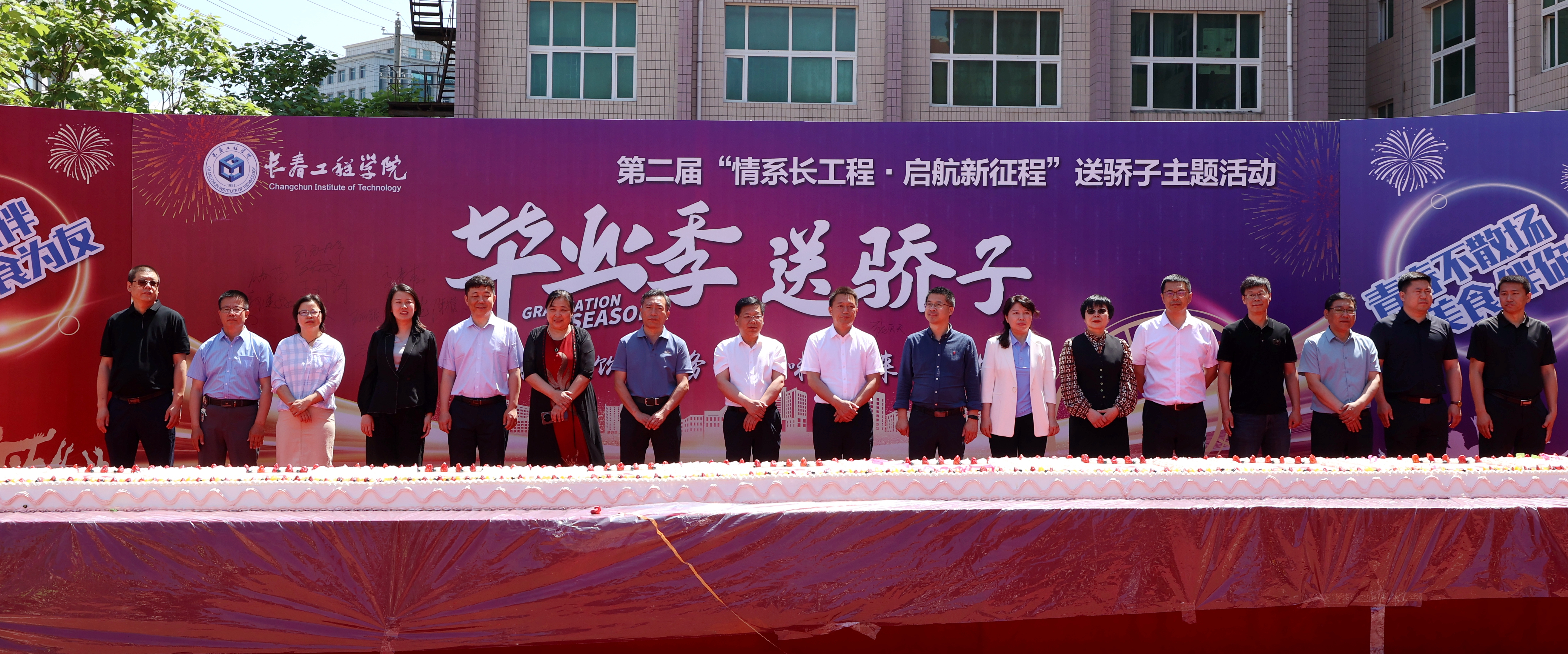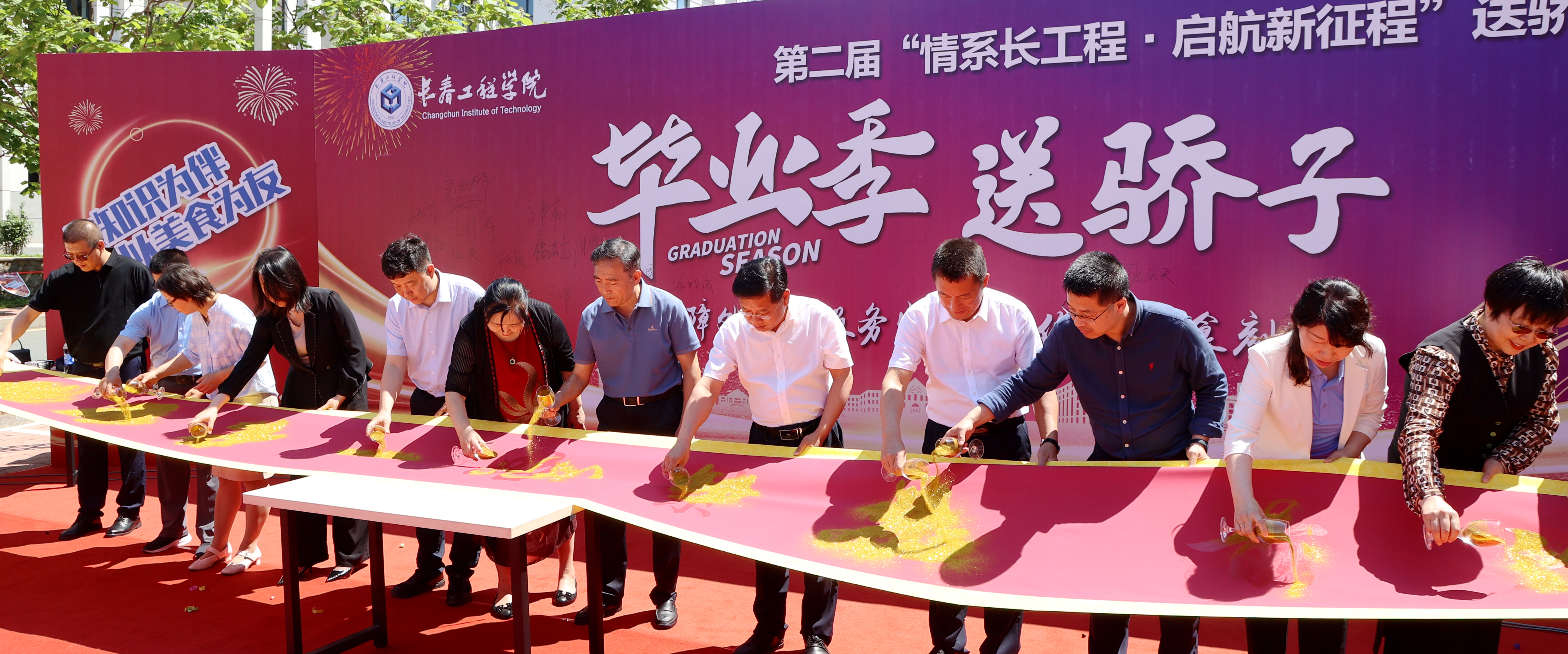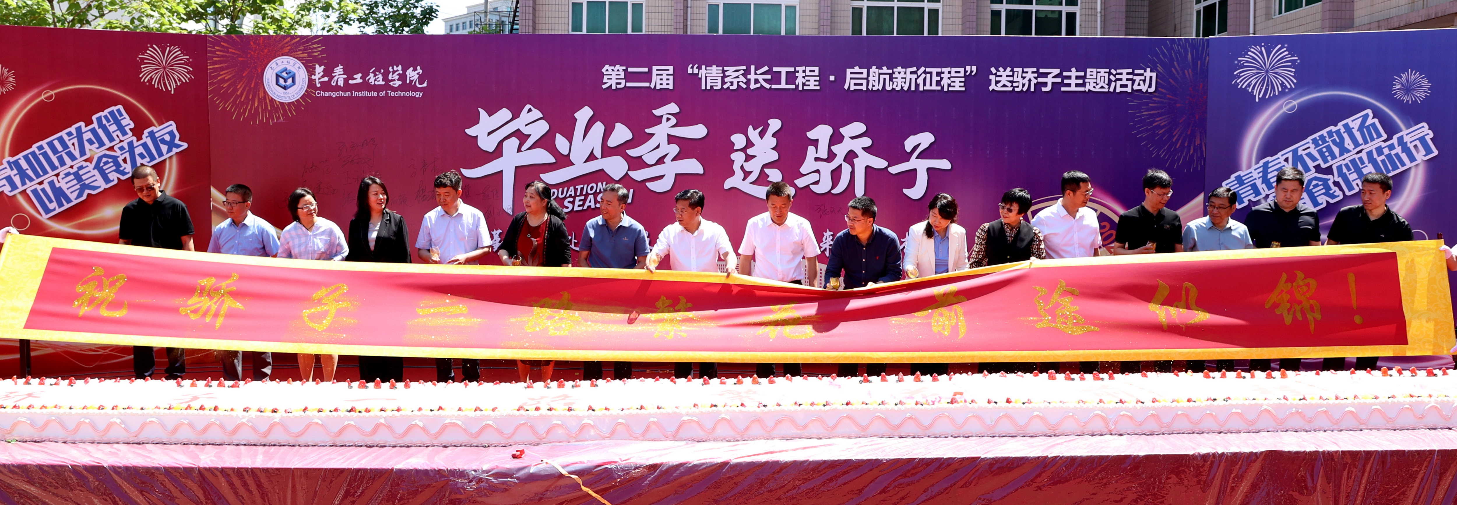 现场举行了洒金仪式,学校领导、各学院领导洒下金箔覆上条幅,“祝骄子一路繁花 前途似锦!”的温馨祝福也在阳光下熠熠生辉。饮食服务中心为毕业生们特别定制了长达10米的蛋糕,学校领导、各学院领导亲自为同学们切分了蛋糕,希望大家在今后的人生旅程里步步“糕”。