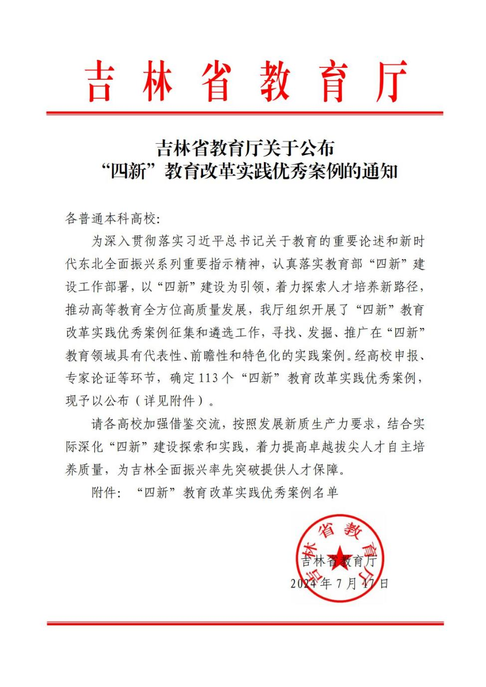 近日,吉林省教育厅印发了《吉林省教育厅关于公布“四新”教育改革实践优秀案例的通知》,我校5个案例入选“四新”教育改革实践优秀案例。