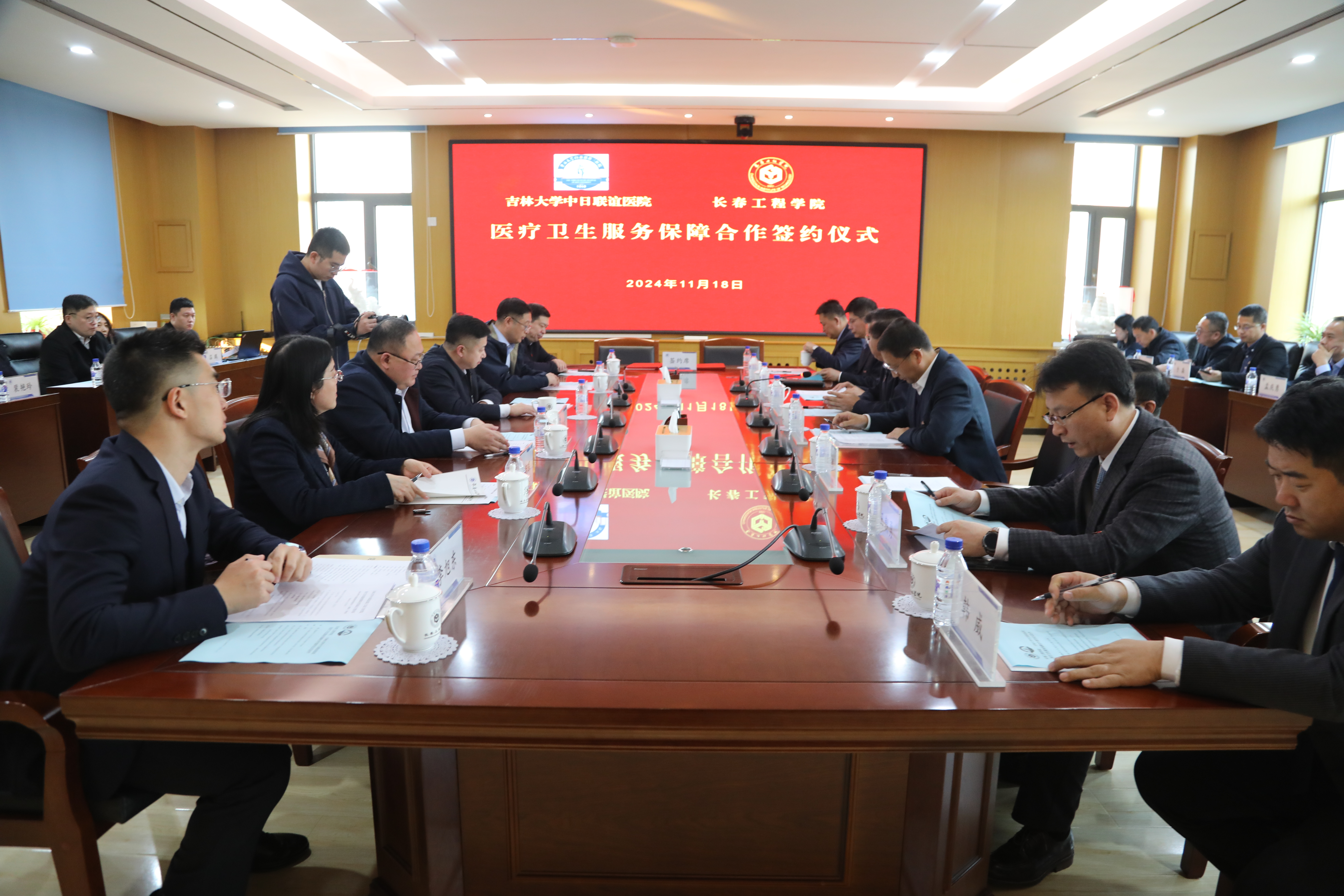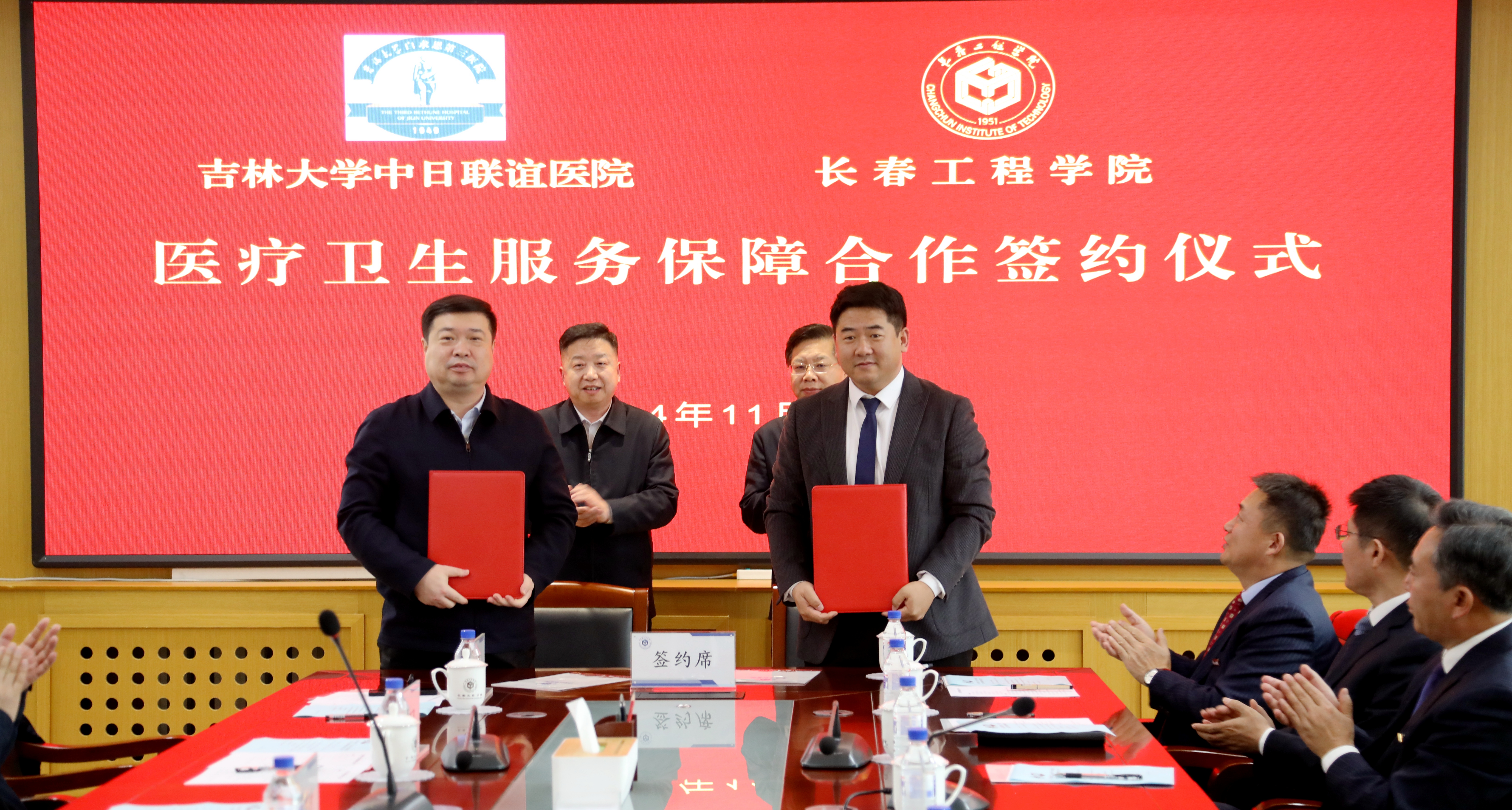 11月18日,学校与吉林大学中日联谊医院医疗卫生服务保障合作协议签约仪式在学校第二会议室举行。学校党委书记陈权,校长宋立军,党委副书记刘兆国,纪委书记王延博,副校长尹志刚、王朝勇、张邦成、韩威,吉林大学中日联谊医院党委书记杜建时,副院长高宇飞、刘俊志、顾锐,纪委书记张朝晖,党委副书记李旭东出席签约仪式。仪式由宋立军校长主持。
