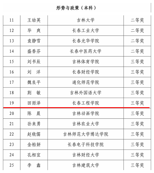 近日,吉林省教育厅发布了2024 年全省高校思政课“精彩一课”教学展示获奖教师和单位名单,我校教师王欣欣获《中国近现代史纲要》组一等奖,李雪妍、田雨泽分别获《毛泽东思想和中国特色社会主义理论体系概论》《形势与政策》组三等奖。
