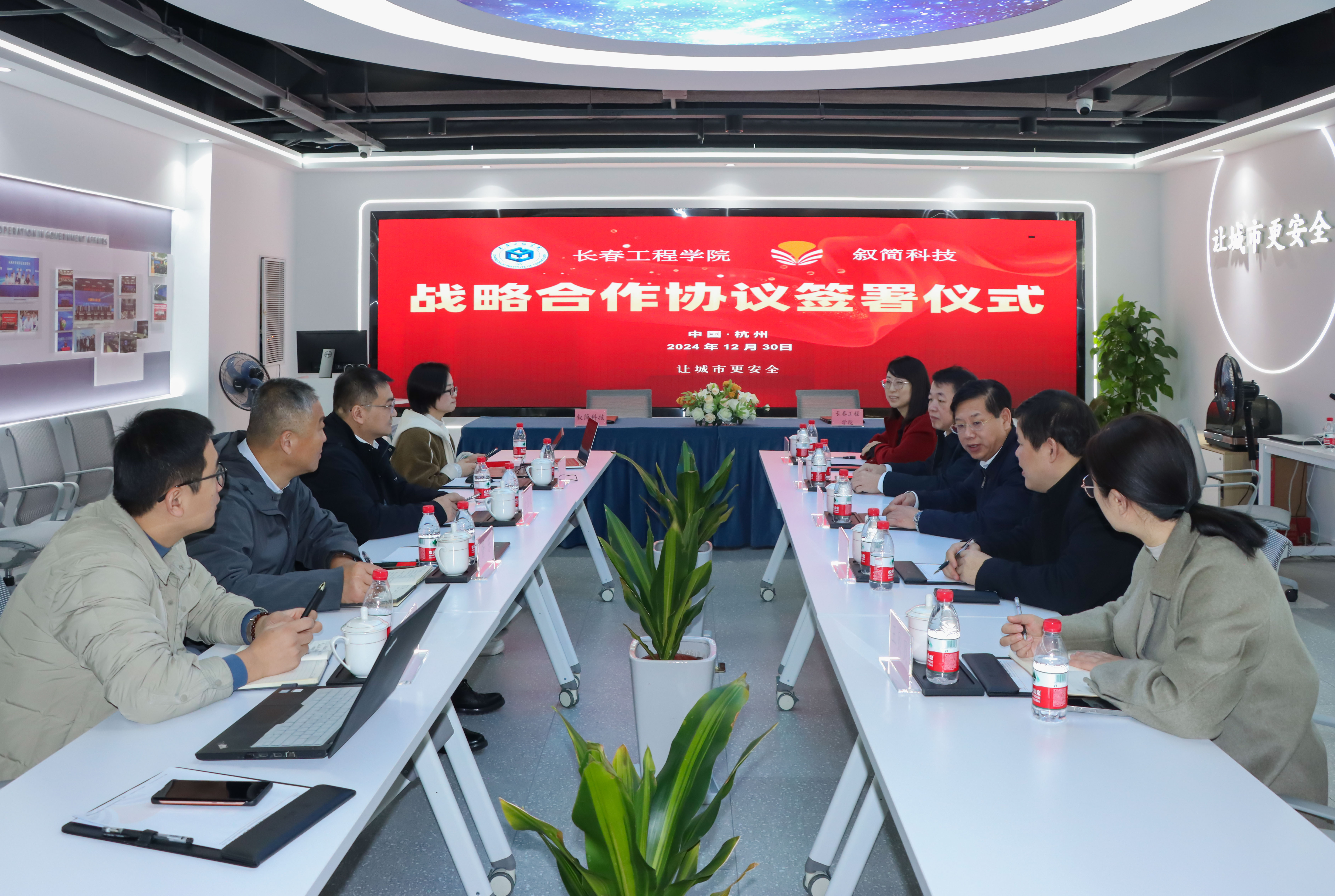 为实现资源共享、优势互补,共同推动安全与应急领域的技术创新与产业发展,2024年12月30日,学校与杭州叙简科技股份有限公司(以下简称“叙简科技”)在杭州举行战略合作签约仪式。叙简科技董事长金国庆、市场部总经理王东孝、产品总监吴艳,我校党委书记陈权出席仪式。
