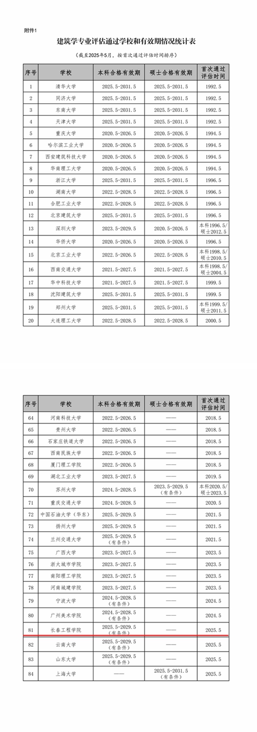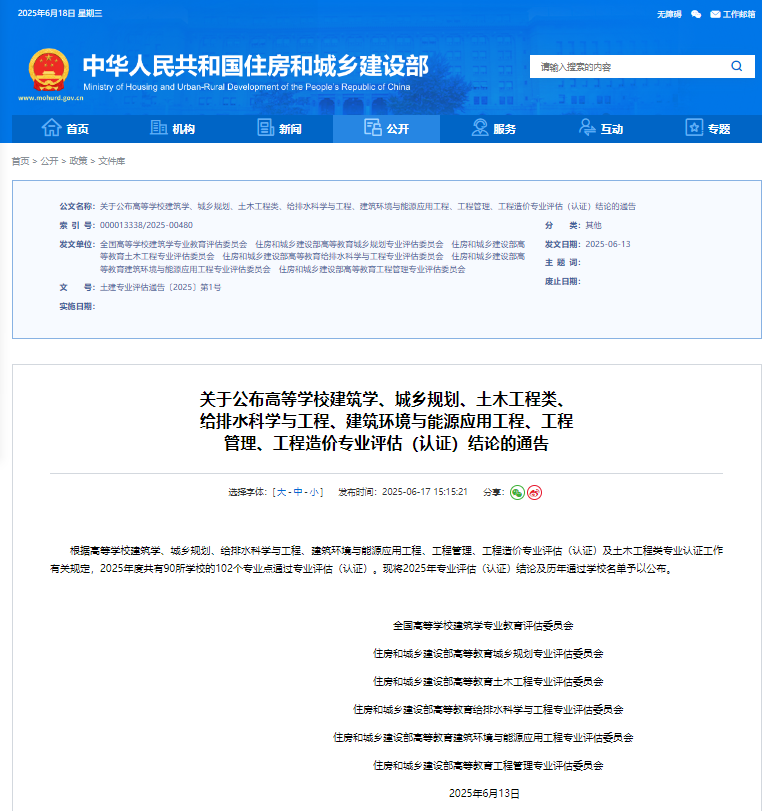 近日,住房和城乡建设部发布《关于公布高等学校建筑学、城乡规划、土木工程类、给排水科学与工程、建筑环境与能源应用工程、工程管理、工程造价专业评估(认证)结论的通告》(土建专业评估通告〔2025〕第1号),我校建筑学专业和工程造价专业通过评估(认证),合格有效期均为4年,自2025年5月起至2029年5月止。