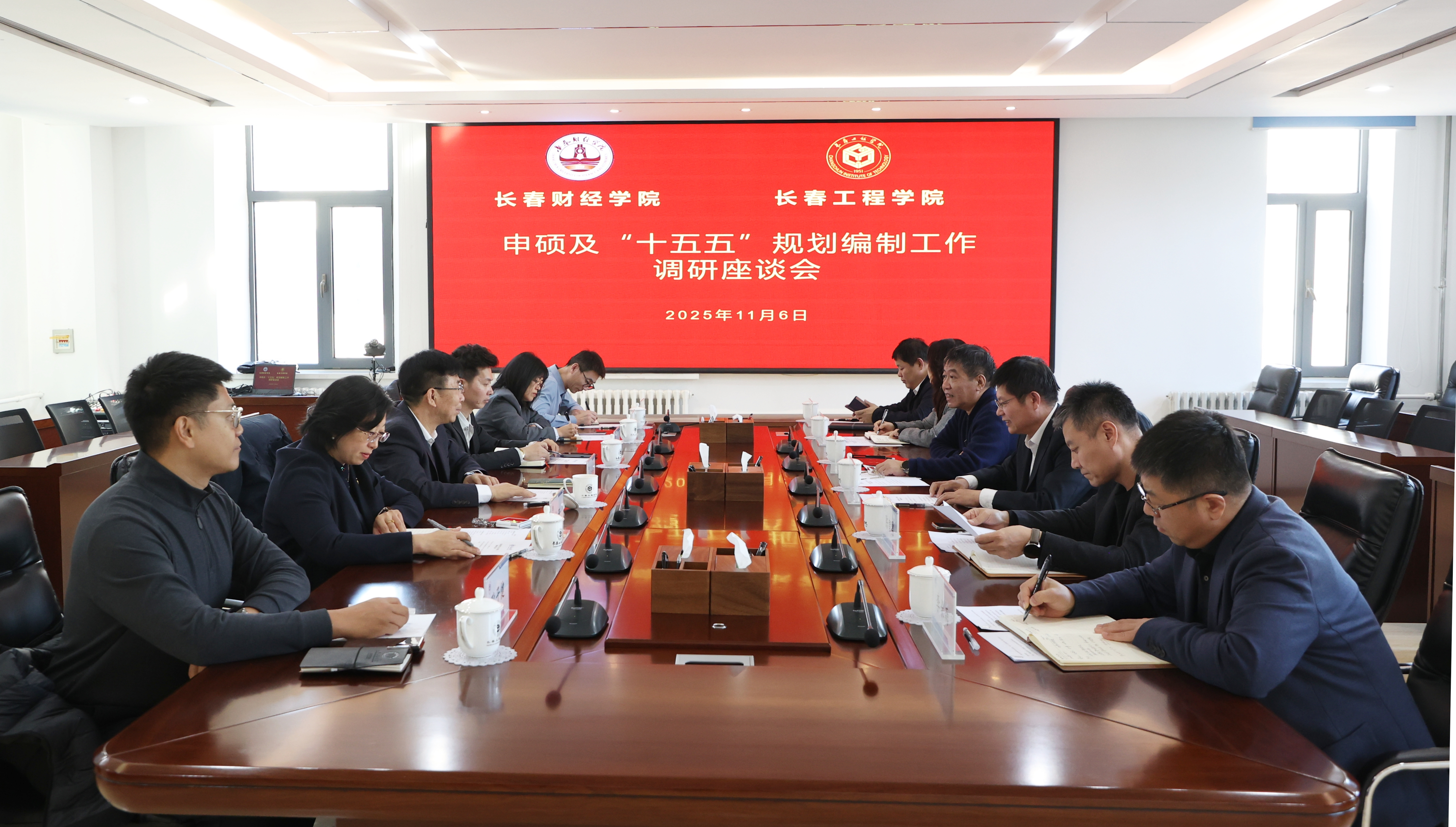 11月6日,长春财经学院校长孙长智一行来我校进行调研,调研座谈会围绕硕士学位授予单位申报及“十五五”发展规划编制工作开展。校长金光勇出席会议,副校长尹志刚主持座谈。