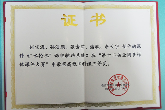 10月29日,第十二届全国多媒体课件大赛的颁奖典礼在北京中央财经大学隆重举行,教育部高教司、职成教司、教育信息管理中心等部门有关领导以及全国高校获奖作品作者代表参加了颁奖典礼。我校在本次比赛中成绩优异,软件职业技术学院孙浩鹏老师主持制作完成的“水工钢闸门”多媒体课件获高校工科组二等奖,能源动力工程学院何宝海老师主持完成的“《水轮机》课程辅助系统”获高校工科组三等奖,软件职业技术学院徐欣欣、能源动力工程学院李岩、外语学院赵凌志老师的参赛作品获优秀奖。