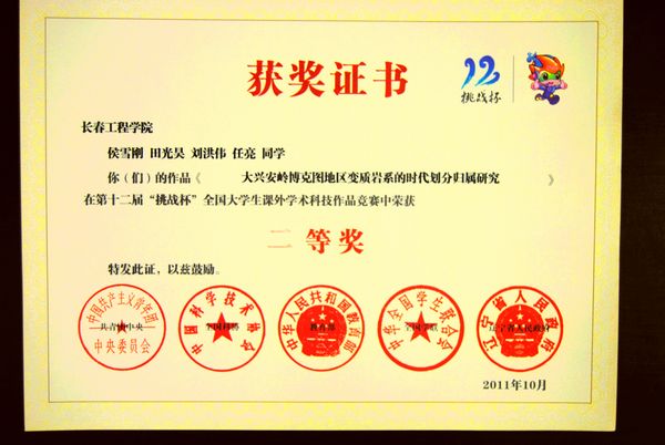10月15日至10月20日,由共青团中央、中国科协、教育部、全国学联和辽宁省政府共同主办的第十二届“挑战杯”全国大学生课外学术科技作品竞赛在大连理工大学成功举行。我校选送的勘查与测绘学院张洪武老师指导的作品《大兴安岭博客图地区变质岩系的时代归属》经过四天紧张激烈的现场展示、答辩和专家评审,最终获得第十二届“挑战杯”全国大学生课外学术科枝作品竞赛终审决赛二等奖。这已是我校连续四届在“挑战杯”全国总决赛中捧得奖项。