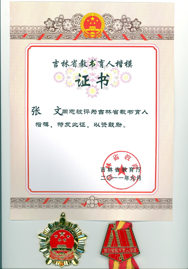 为热烈庆祝教师节,弘扬人民教师的高尚师德,认真履行人民教师崇高使命,在全社会进一步营造尊师重教的良好风尚,努力建设一支高素质专业化教师队伍,促进教育事业科学发展,吉林省教育厅决定在2011年教师节前组织开展教书育人楷模评选活动,全省教育系统共评选12名。我校张文老师经学校推荐、校内公示、教育厅评选,喜获“吉林省教书育人楷模”荣誉称号。9月8日教育厅在松苑宾馆进行了表彰并颁发证书和奖章。