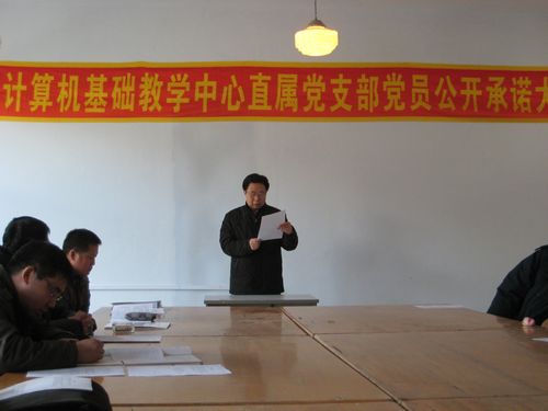 根据学校党委对创先争优活动的安排部署,计算机基础教学中心直属党支部于3月16日下午在本单位会议室召开了党员公开承诺大会。在会上,每位党员紧紧围绕创先争优活动的主要内容,结合自身实际,向党组织和广大群众作出了郑重承诺。
