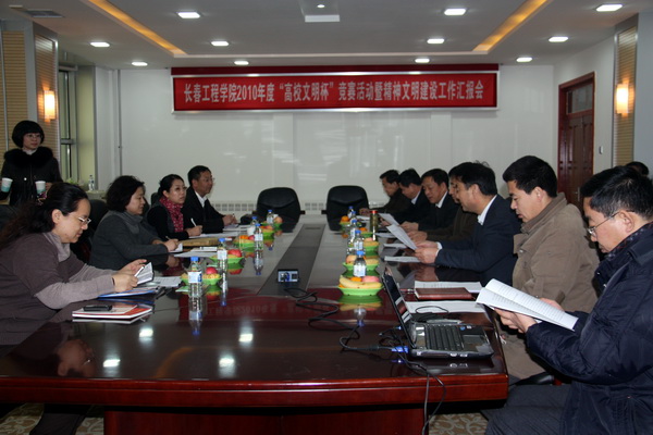 12月1日上午,中共长春市委高教处郑学华处长、长春市文明办赵芹调研员一行五人对我校2010年度“高校文明杯”竞赛和精神文明建设工作进行了检查。党委书记李春生、院长韩立强等学校领导亲切看望了检查组成员,并简要介绍了我校一年来精神文明创建活动取得的成绩。党委副书记吴占军向检查组汇报了我校争创“高校文明杯”和精神文明建设工作开展情况。学校精神文明办全体成员、有关部门负责人参加了汇报。检查组一行观看了我校精神文明建设专题片,查阅了相关资料,参观了校史馆,实地检查了学生公寓和大学生饮食服务中心。检查组肯定了我校在精神文明建设工作中取得的成绩,并提出了希望和要求。