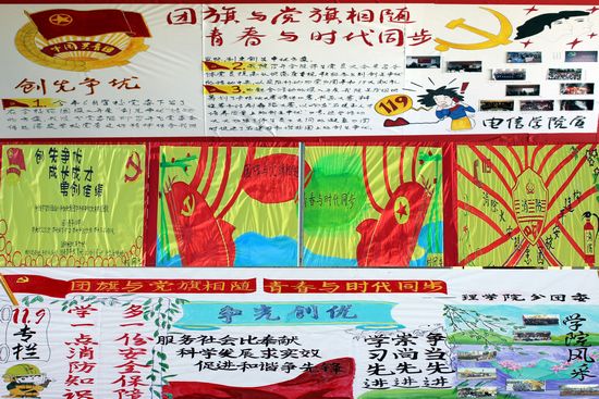 11月3日-5日,校团委在湖西校区雕塑广场、湖东校区图书馆门前举办了以“团旗与党旗相随青春与时代同步”为主题的宣传板展示活动。校团委、各分团委分别以“创先争优、团组织工作风采以及11.9防火宣传”为主要内容进行展示。通过此次展示活动,增进了团组织之间的交流,通过直观、鲜明的宣传手段,深化了团员青年永远跟党走的理想信念,使青年学生增强了团员意识,使各级团组织进一步明确了责任和使命,推动了学校共青团工作的开展。