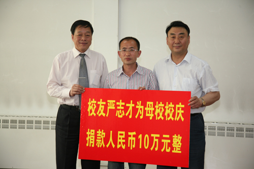 2010年6月3日上午,我校青海省校友严志才为母校校庆捐款仪式在湖西校区第七教学楼十楼会议室举行。校长韩立强、校党委副书记吴占军出席捐赠仪式。学校校庆工作办公室常务副主任、机关党委书记杨悦新,勘查与测绘工程学院分党委书记吴景华,勘查与测绘工程学院院长王志华,校友严志才的老师代表、教务处副处长潘殿琦及有关教师参加了捐赠仪式。