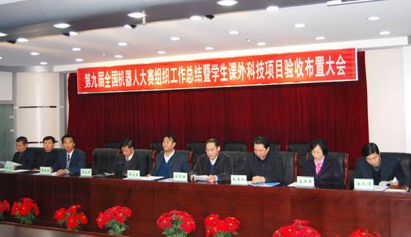 12月10日下午,学校在十三楼报告厅隆重召开第九届全国机器人大赛组织工作总结暨学生课外科技活动项目验收布置大会。校长韩立强、副校长任玉珊、党委副书记吴占军、纪委书记张未知出席了会议。参加大会的还有教务处、学生处、校团委、电信学院主要负责人,各教学单位主管学生课外科技活动的负责人,2008年学生课外科技项目负责人,机器人大赛筹备工作领导小组成员,各工作组负责人,还有部分大赛指导教师代表和学生代表。会议由教务处处长黄金林主持。