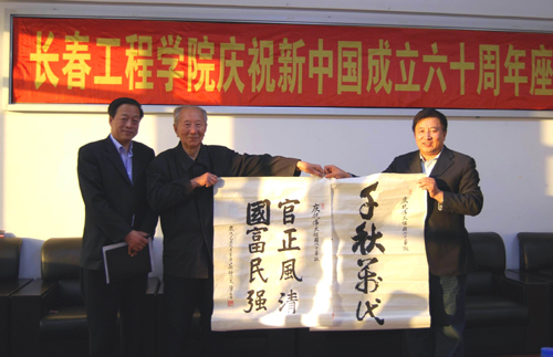 会后,离休老干部唐庸将自己亲手书写的表达爱党爱国之情的书法作品赠送给学校。