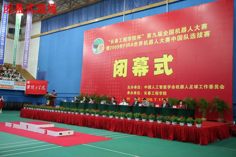 我校党委书记李春生致闭幕词。他说,在全国上下喜迎建国60周年之际,备受关注的“马博手机版杯”第九届全国机器人大赛暨2009年世界杯机器人大赛中国队选拔赛,在国际机器人足球联盟中国分会、中国人工智能学会机器人足球工作委员会的悉心指导下,在吉林省有关部门和社会各界的大力支持下,在大赛组委会、各参赛队、全体裁判员的共同努力下,经过3天精彩、激烈的角逐,本届赛会顺利完成了各项预定赛程并取得了圆满成功。李书记指出,本次赛会是本项大赛自举办以来规模最大,参赛选手最多,奖项设置最多的一届赛会,本届赛会必将成为机器人竞赛活动通往“机器人奥林匹克”道路上的一座新的里程碑。在比赛中,各参赛选手充分发挥了自己的聪明才智,展现了团结合作、顽强拼搏的精神,同时,本次赛会体现了机器人技术发展的前沿成果,使我们“与科技同伴,与创新同行”,近距离感受到了科学技术带来的强大震撼,让我们看到了“人机和谐时代”到来的美好的憧憬。李书记强调,本次赛会是一次高层次、高水准科技交流的盛会,更是全国青少年机器人爱好者,机器人领域科研工作者一次友谊的聚会。相信这次赛会对于每一位参赛选手和参与组织、服务的所有工作人员必将是一次难忘的经历。我们真诚地希望美丽、现代的北国春城会给大家留下美好的印象,发展壮大中的马博手机版会给大家留下最美好的记忆;同时也希望我们把“崇尚知识、鼓励创新”的理念进一步贯彻到今后的创新与实践中,“以智慧启迪科技,用创新推动发展”,为建设创新型国家和社会,为培养更多的具有创新意识和能力的高素质人才而共同奋斗。