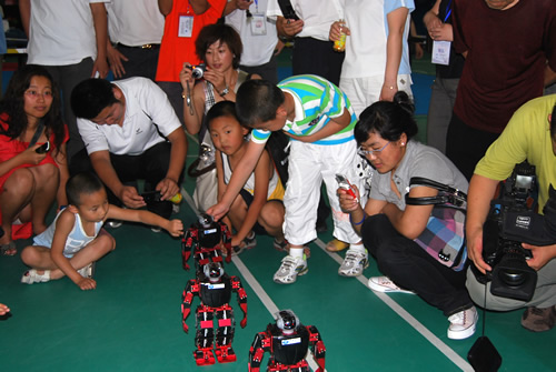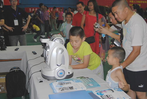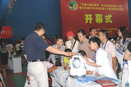 “这个机器人真好玩!它能跳舞吗?”一帮小朋友围在机器人展台前问这问那。恰逢周六,许多长春市民来到第九届全国机器人大赛赛场观看。尤其是小朋友们,表现出对机器人的浓厚兴趣。本届比赛显著的特点是增加了中小学比赛,对于拓展中小学生视野及动手能力有积极的促进作用 。长春市45中小学部、长春市45中中学部、东北师范大学中学部、东北师范大学小学部、吉林省二实验学校都有代表队参赛。