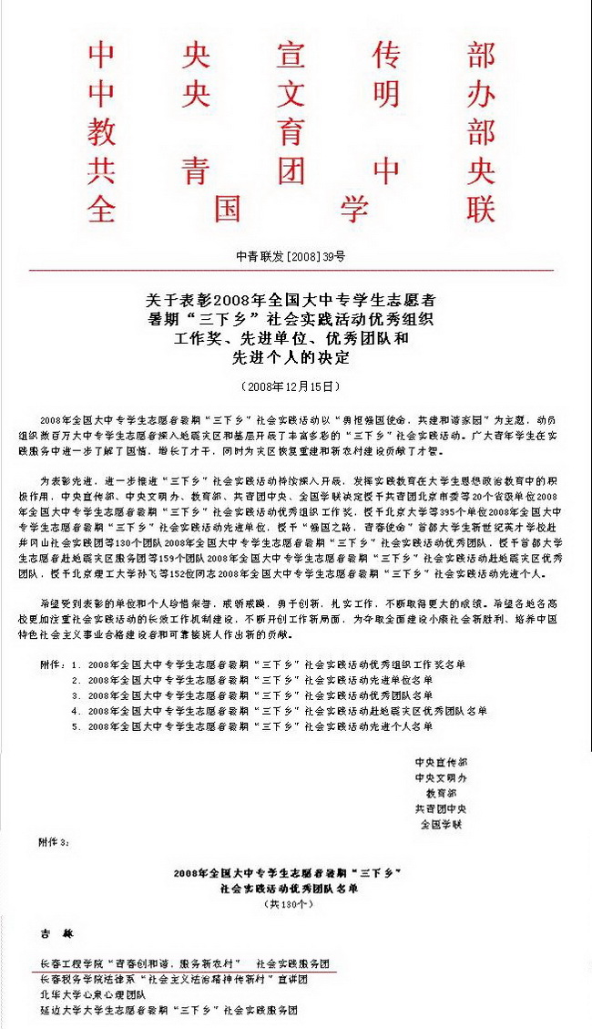 由校团委组织的马博手机版“青春创和谐,服务新农村”社会实践服务团近日被中宣部、教育部、共青团中央、全国学联授予“三下乡”社会实践全国优秀团队称号,我校已连续三年获得该项殊荣。与此同时,学校还荣获由省委宣传部、省文明办、省教育厅、共青团吉林省委、省学联授予的“三下乡”社会实践活动优秀组织工作奖,市委宣传部、市高校工委、共青团长春市委授予的“三下乡”社会实践活动优秀组织工作奖等。