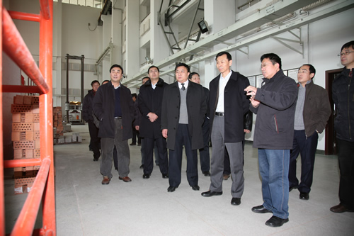在土木工程结构实验室考察时,陈晓光副省长在千吨压力机前驻足,听取专业负责人的介绍,观看了学生的实际操作,了解实验室建设和仪器设备的使用情况。最后,他们来到了土木工程实践基地,参观了施工现场。