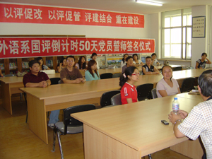 按照学校党委统一要求,9月5日下午2时10分外语系在71209准时召开国评倒计时50天党员誓师签字仪式。