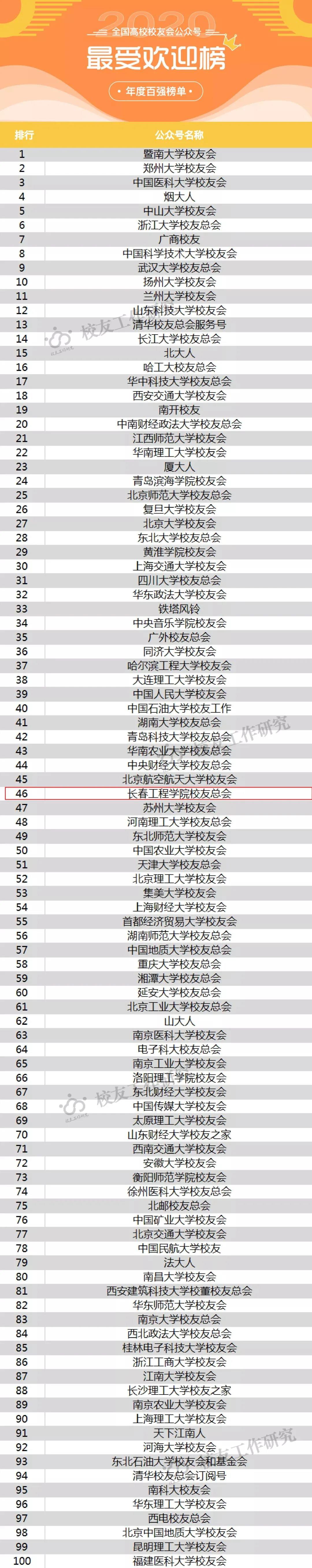 2月5日,“校友工作研究”发布了《全国高校校友会微信公众号2020年度百强榜单》,“马博手机版校友总会”分别位列“最佳全能榜”第26位、“最受欢迎榜”第46位、“最具传播力榜”第63位,以上三个榜单均比上一年度有所提升,其中代表综合成绩的“最佳全能榜”已连续三年位列吉林省第1位。该榜单是基于“校友工作研究”收集的全国400多个高校校友会公众号样本库产生。