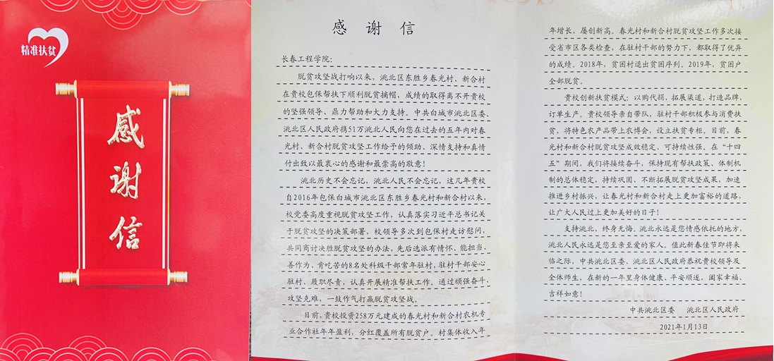 今年,中共洮北区委、洮北区人民政府又给学校发来感谢信。“有情怀、能担当、善作为、肯吃苦”,信中这样形容我们的驻村干部;“洮北永远是您情感依托的地方,洮北人民永远是您至亲至爱的家人”,信中这样形容我们的帮扶关系。