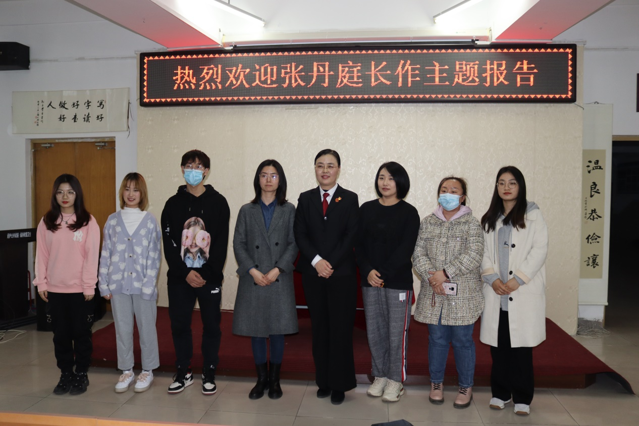 张丹庭长讲述了法律的重要性及意义,并通过近年来发生在我们身边的案例深入浅出地为大家阐述了盗窃罪、诈骗罪、危险驾驶罪、国家级考试作弊行为、故意伤害罪、聚众斗殴、寻讯滋事、非法拘禁、毒品犯罪等犯罪行为的司法解释及严重后果,为学生科普宣传了一些基本法律知识。讲座结束后是互动环节,同学们咨询了法律相关问题,张丹庭长为同学们作出解答,帮助大家进一步了解法律知识。