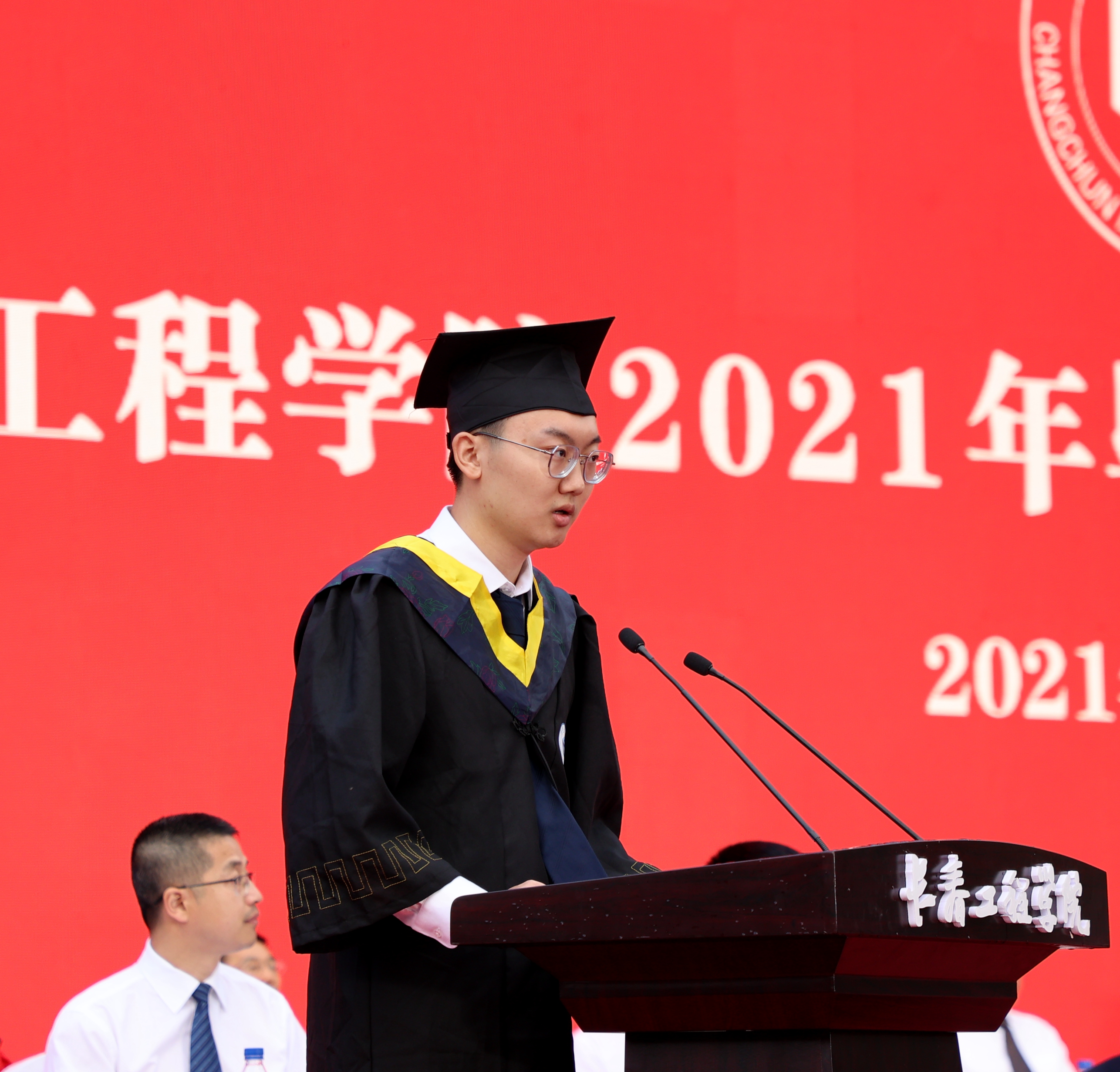2020届电气与信息工程学院的靳昌伟校友,代表疫情期间没有返校参加毕业典礼的毕业生发言,他代表全体2020届毕业生表达了对母校的感恩之情,并祝愿母校70周岁生日快乐;能源动力工程学院动力1741班的刘帅宏同学代表2021届毕业生发言,她回顾了大学四年的成长之路,表达了对母校、恩师、挚友的浓浓不舍与深深谢意。