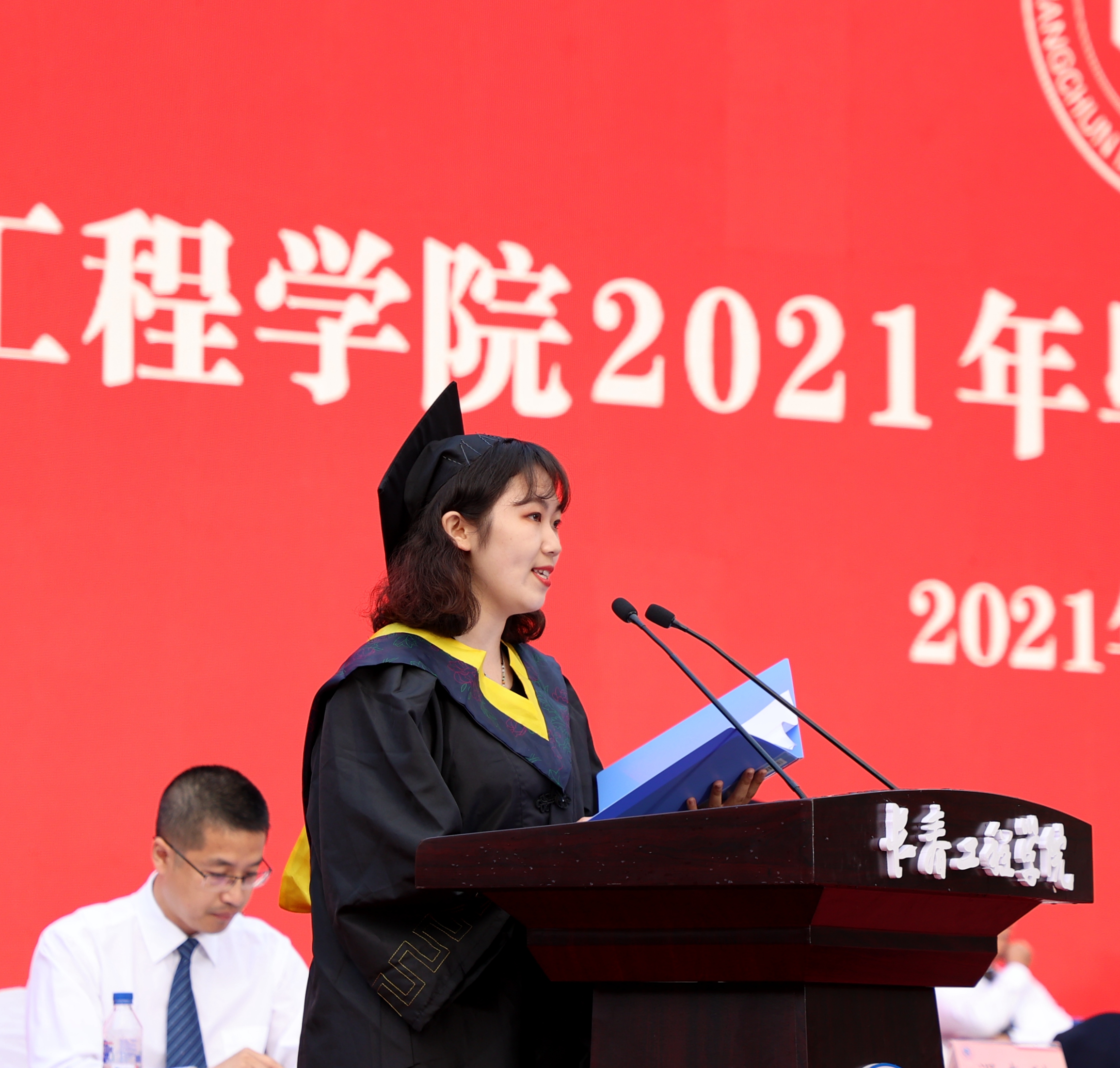 土木工程学院教师宿晓萍代表全体教师发言,她向圆满完成学业的2021届学子们表示祝贺,并叮嘱大家要始终心怀梦想,执着向前,心存善良。