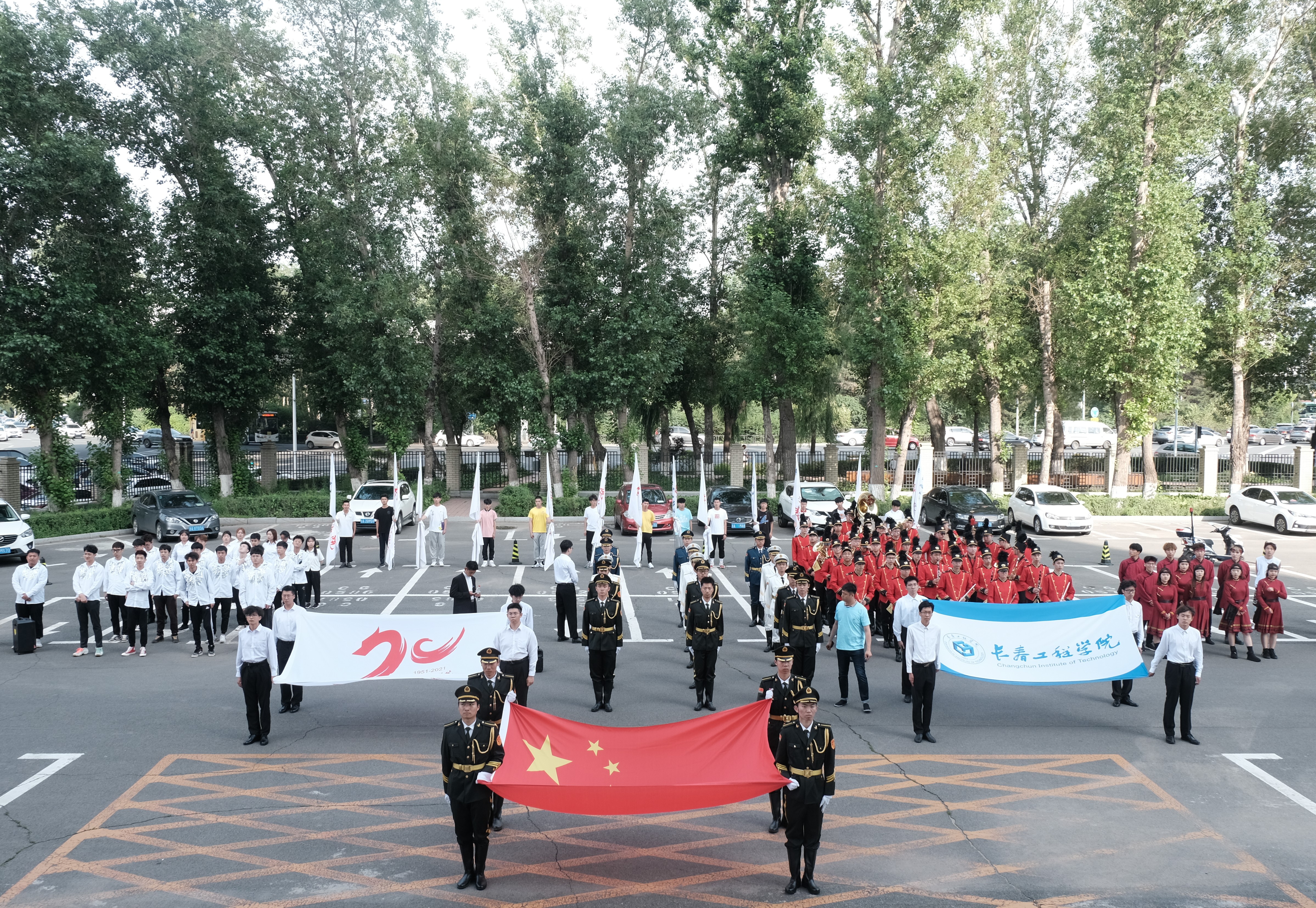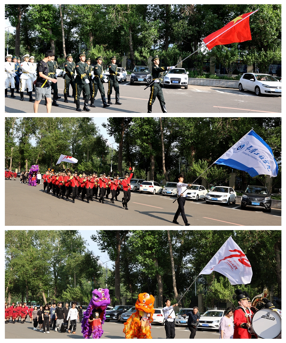 活动现场,学校国旗护卫队、管乐团、狮舞团、舞蹈团、合唱团、街舞团等社团成员身着各社团统一服装,在第七教学楼前有序集结。
