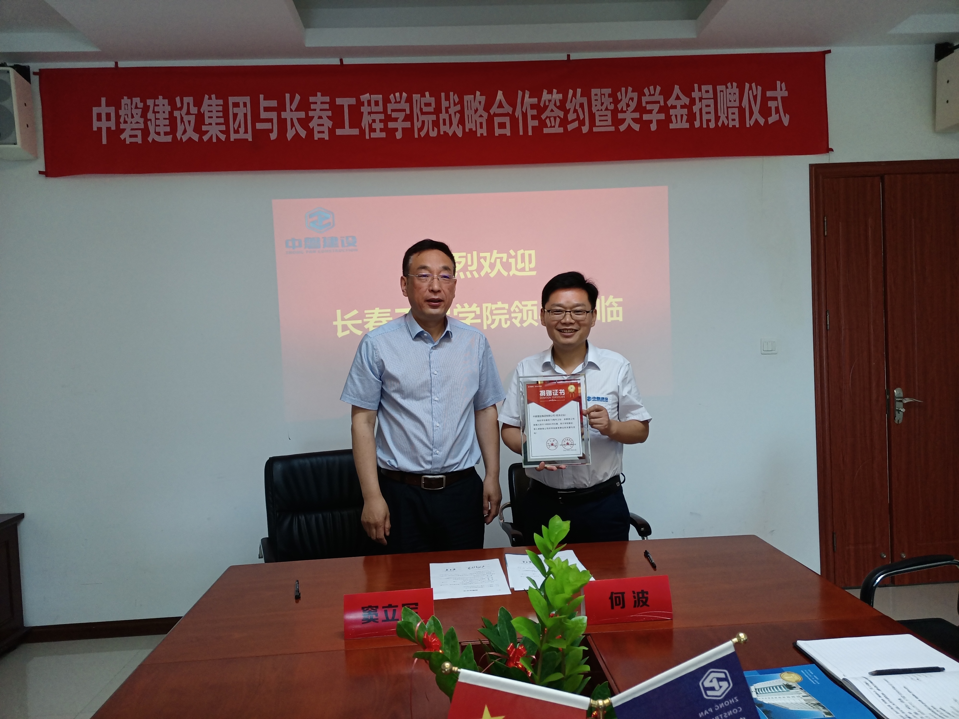 窦立军副校长代表学校与何波校友创办的中磐建设集团有限公司签订了产学研合作暨校外实习基地建设协议书,并举行了签约仪式;何波、应汉林等校友为了表达对母校的谢意及对学弟学妹们的殷切希望,以校友公司名义向母校捐赠10万元,用于学校建设,窦立军副校长代表学校向何波校友颁发了捐赠证书。