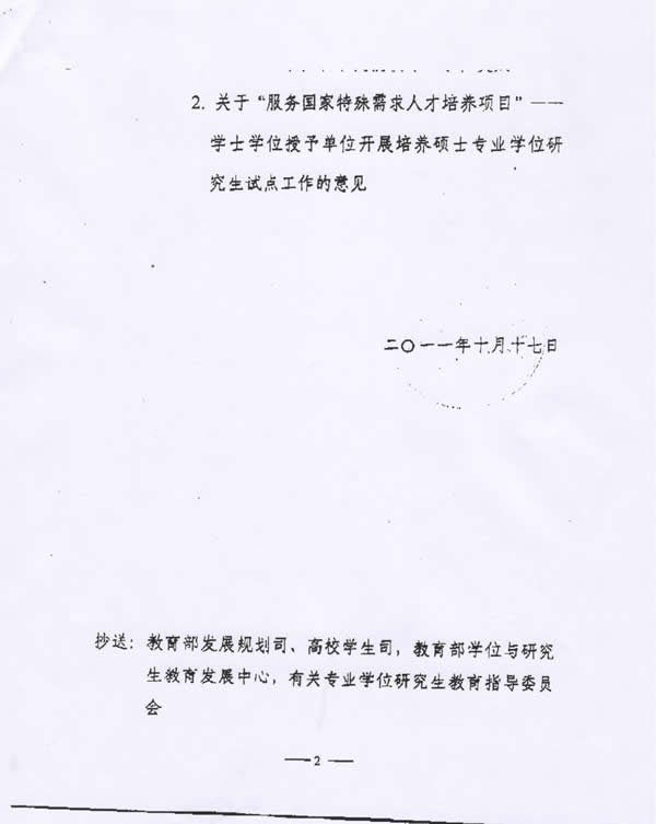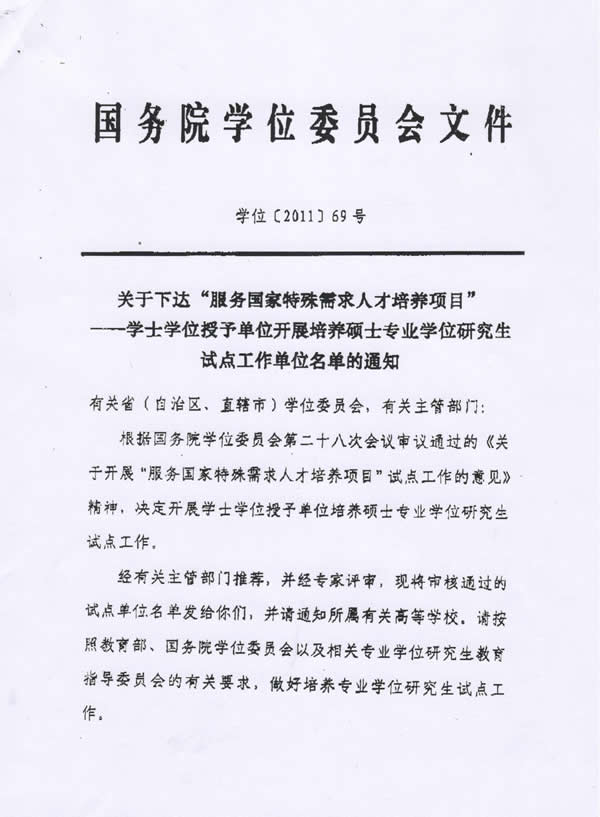 关于下达“服务国家特殊需求人才培养项目”—学士学位授予单位开展培养硕士专业学位研究生试点工作单位名单