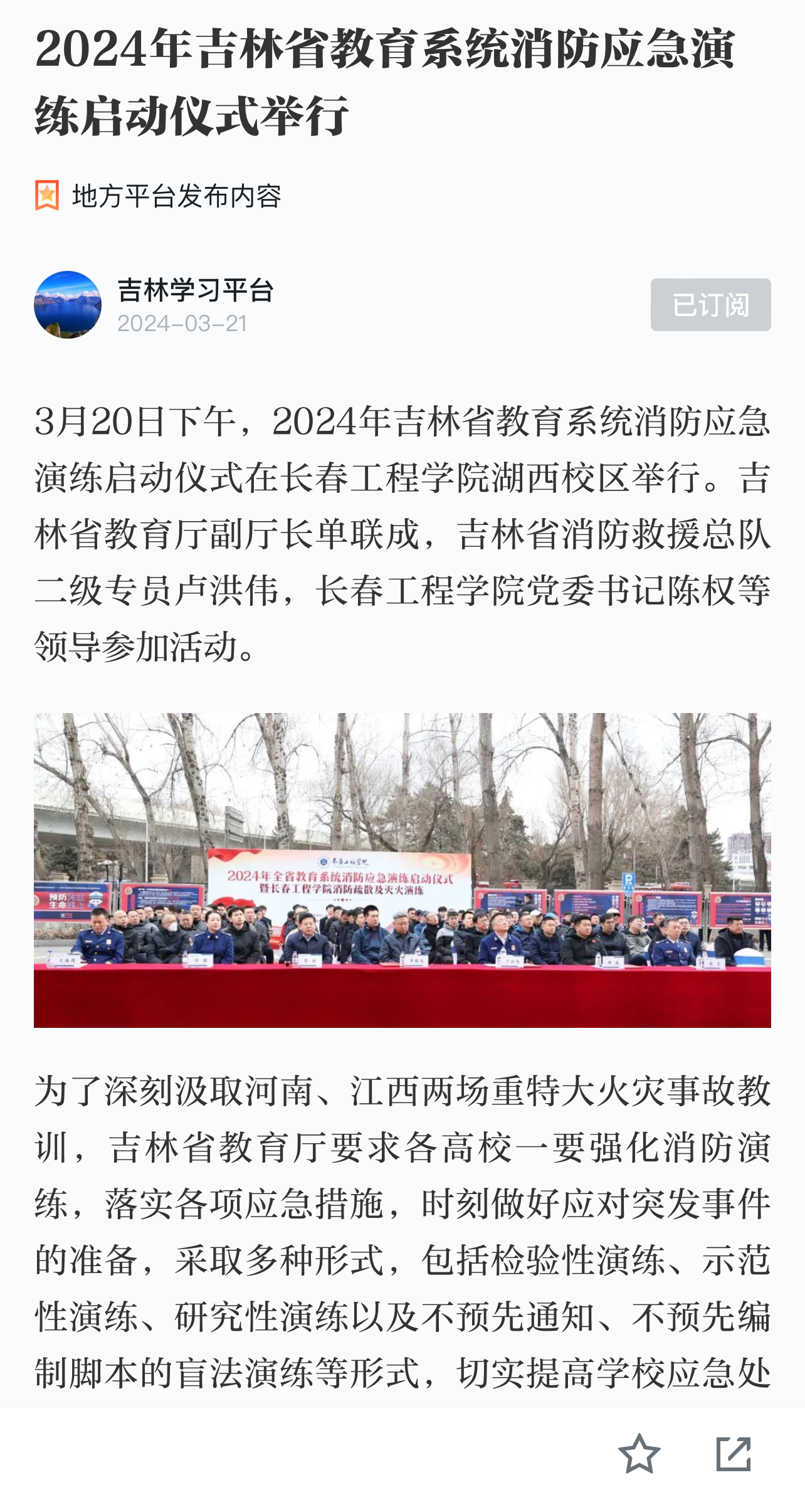 学习强国、吉林日报报道我校举办的2024年吉林省教育系统消防应急演练启动仪式