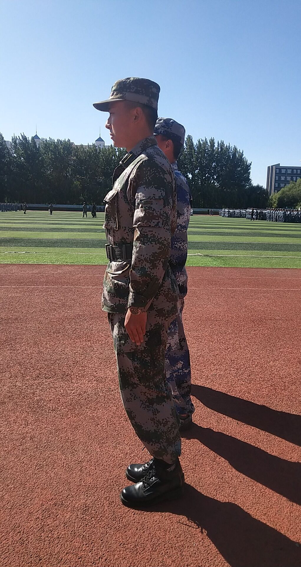 " 当兵后悔两年,不当兵后悔一辈子。虽然训练很苦,很累,但是却让我在最短时间内得到了最好的蜕变。我觉得自己变得更坚强了,也更男人了。我不再畏惧,更加有魄力,思维也更开阔了。" 来自数媒 19 级学生贾功策同学说,他在 2016 年入伍,服役于陆军某部队。今年回校后的他来不及整理行囊,就走向军训场,成为了一名编外的军训教官,协助教官们完成军训工作。在生活中和蔼可亲的同学,走向军训场就成了一名严厉的教官,率先垂范做表率、脚踏实地拓坦途,军训方队因此也成为了最让人放心的一只排头队。